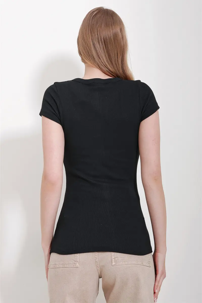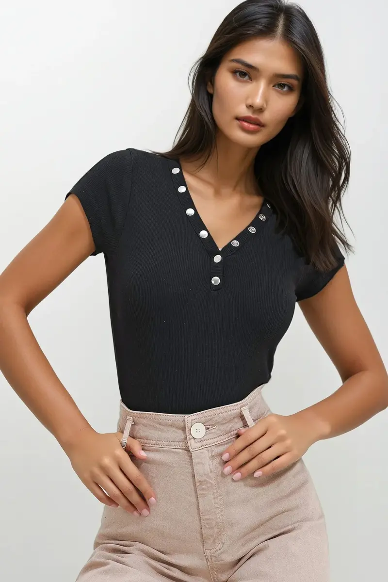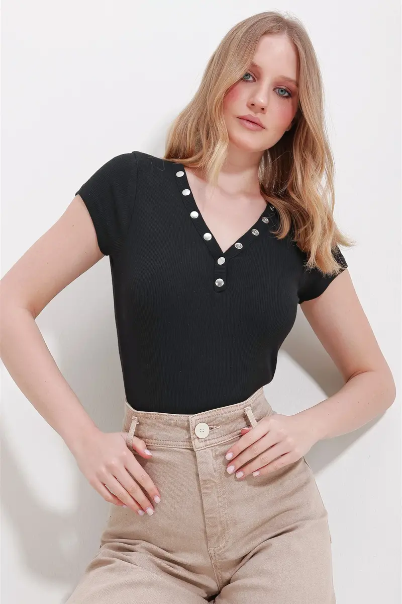 Kadın Siyah V Yaka Çıt Çıt Çıt Kapamalı Bluz ALC-X11576-SİYAH