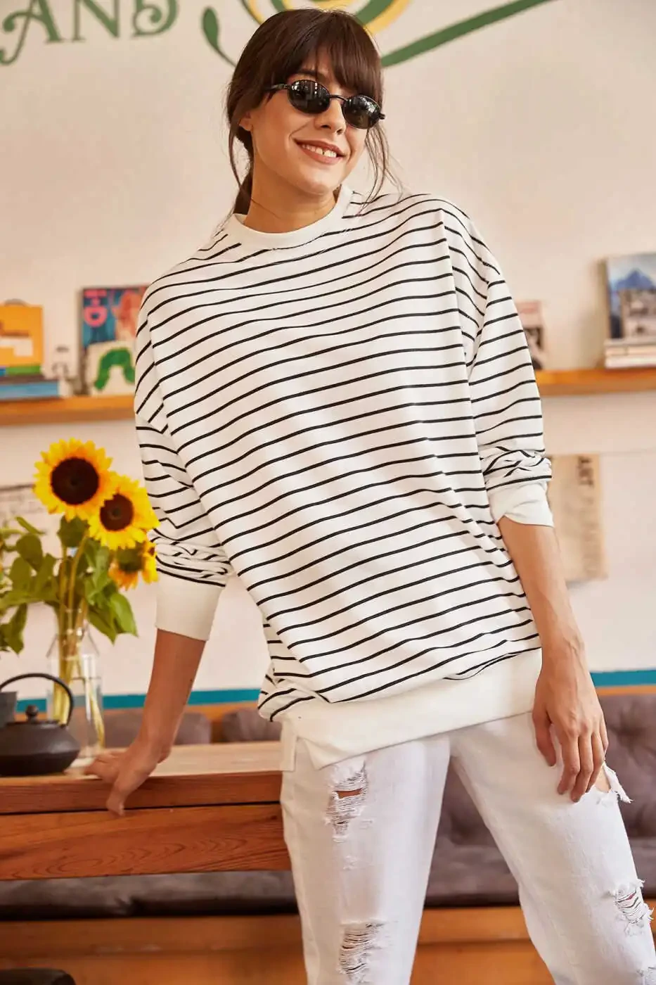 Combining style and comfort, this chic Women's Black Collared Thick Sweatshirt SWT-19000188 is perfect for everyday wear. The striped pattern adds a touch of elegance to its cozy design.