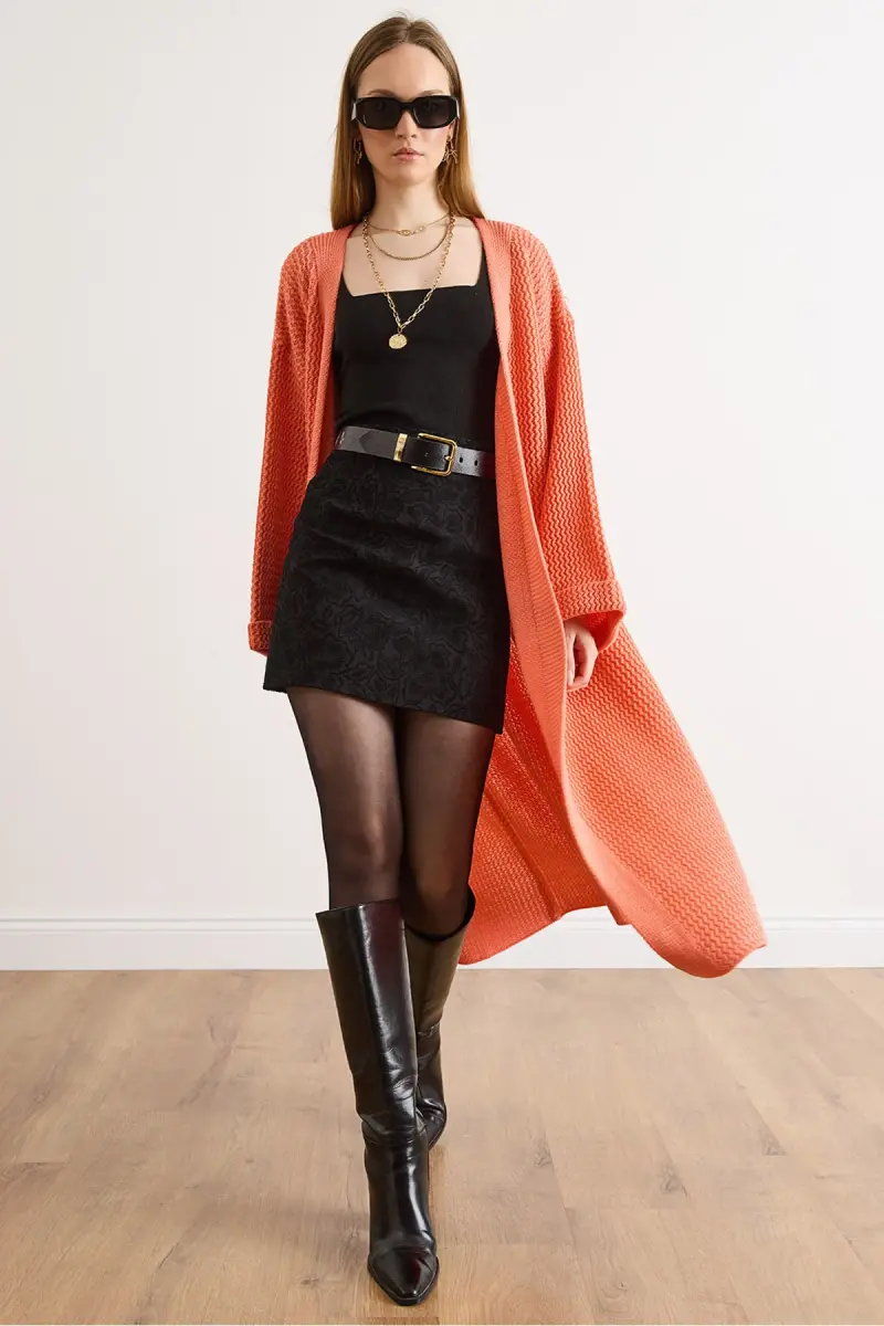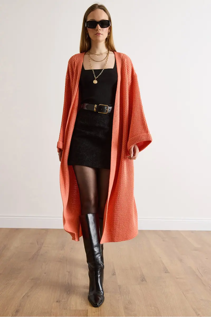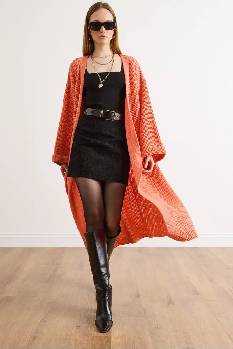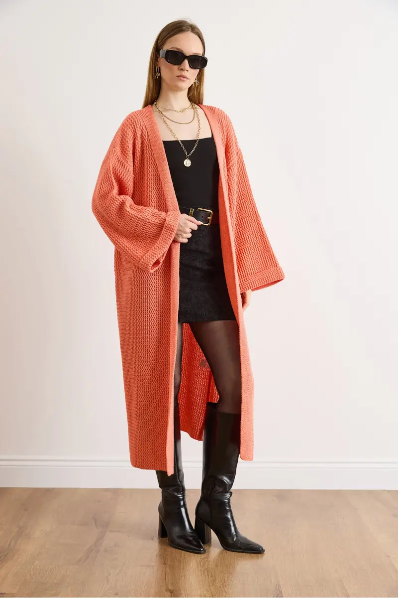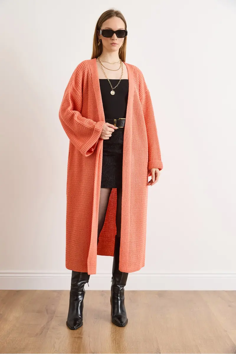 Kadın Somon Manşeti Katlamalı Maxi Triko Hırka HRK-19000297-Somon