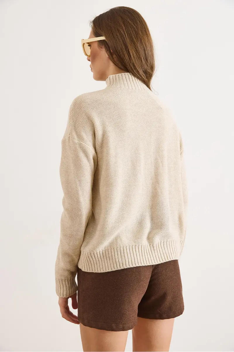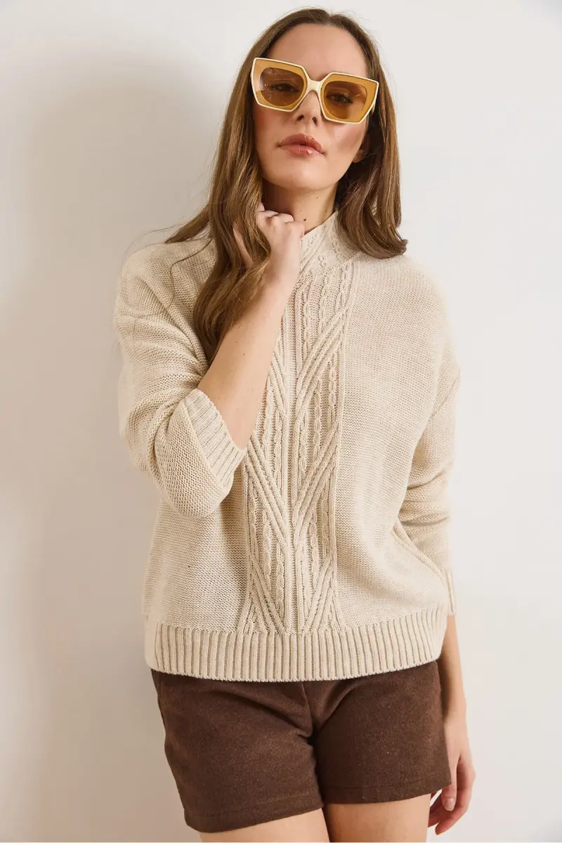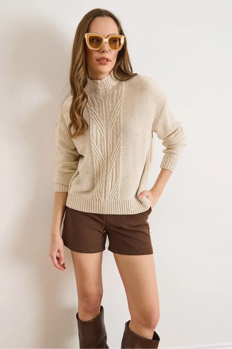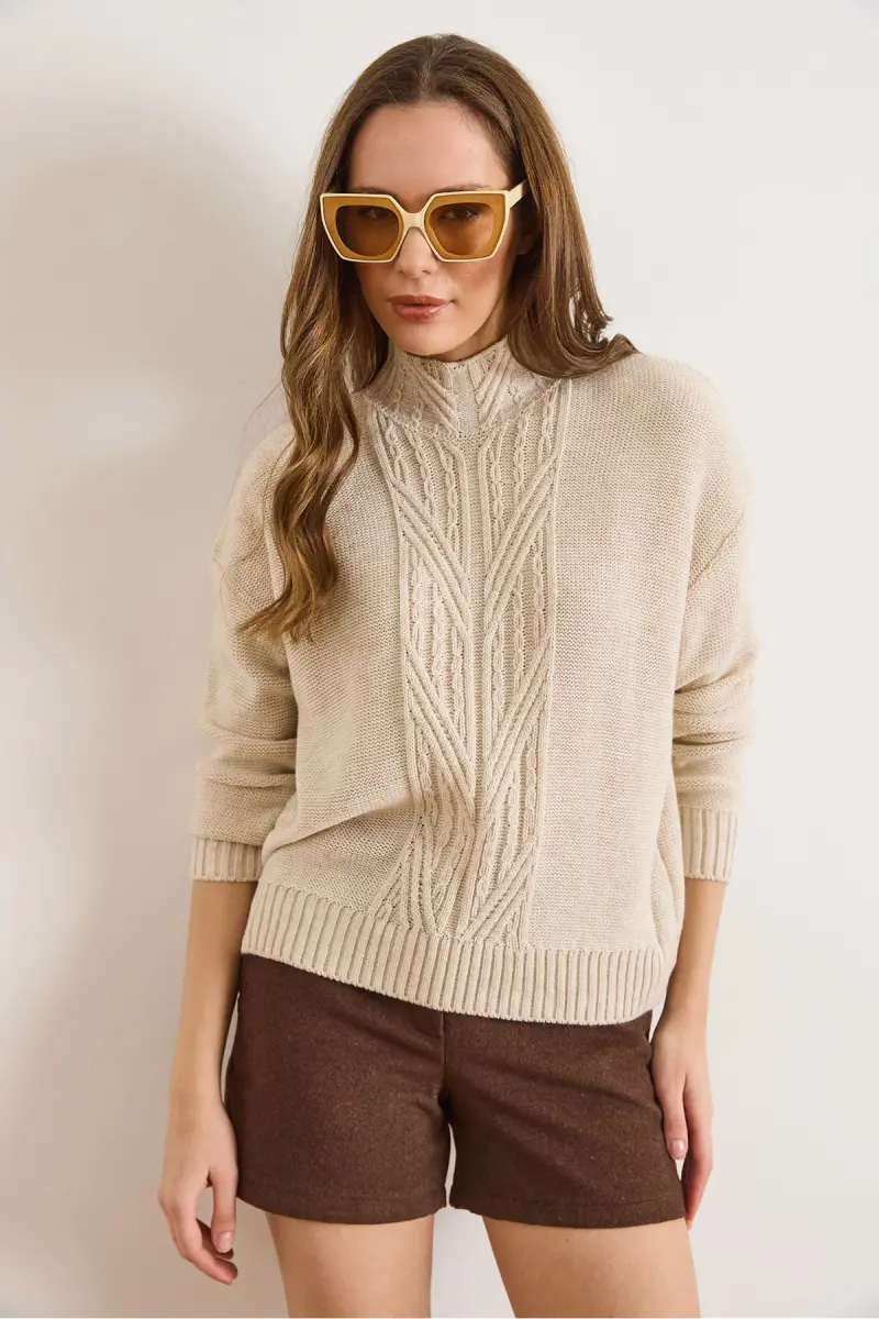 Kadın Taş Dik Yaka Ortası Saç Örgülü Triko Kazak KZK-19000912-Taş
