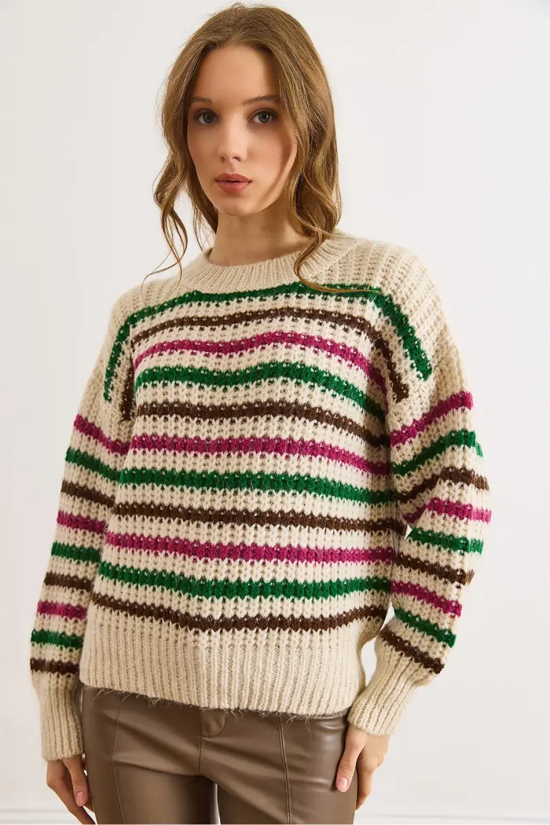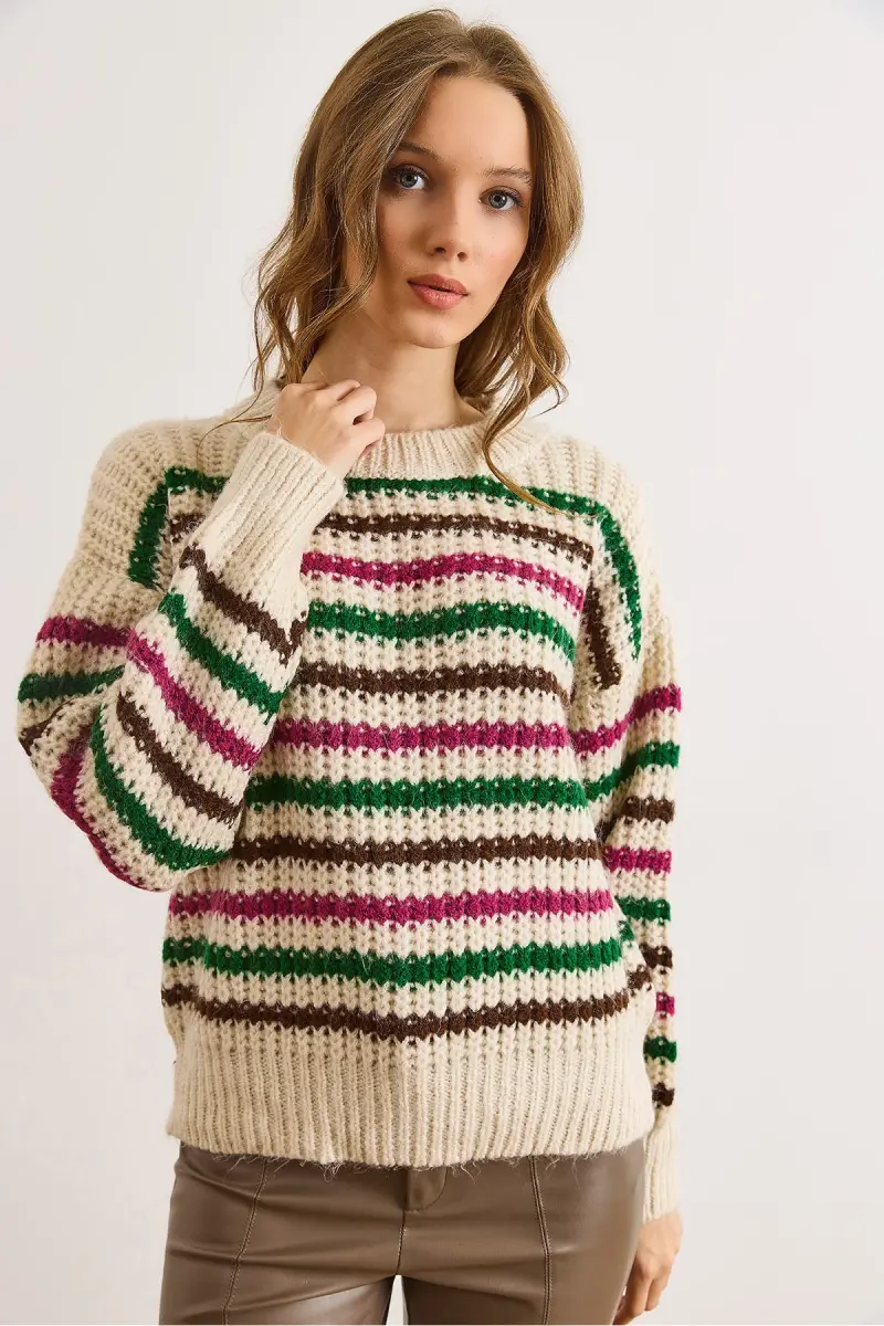 Kadın Taş Fuşya Renkli Çizgili Kalın Yumuşak Dokulu Triko Kazak KZK-19000917-Taş Fuşya