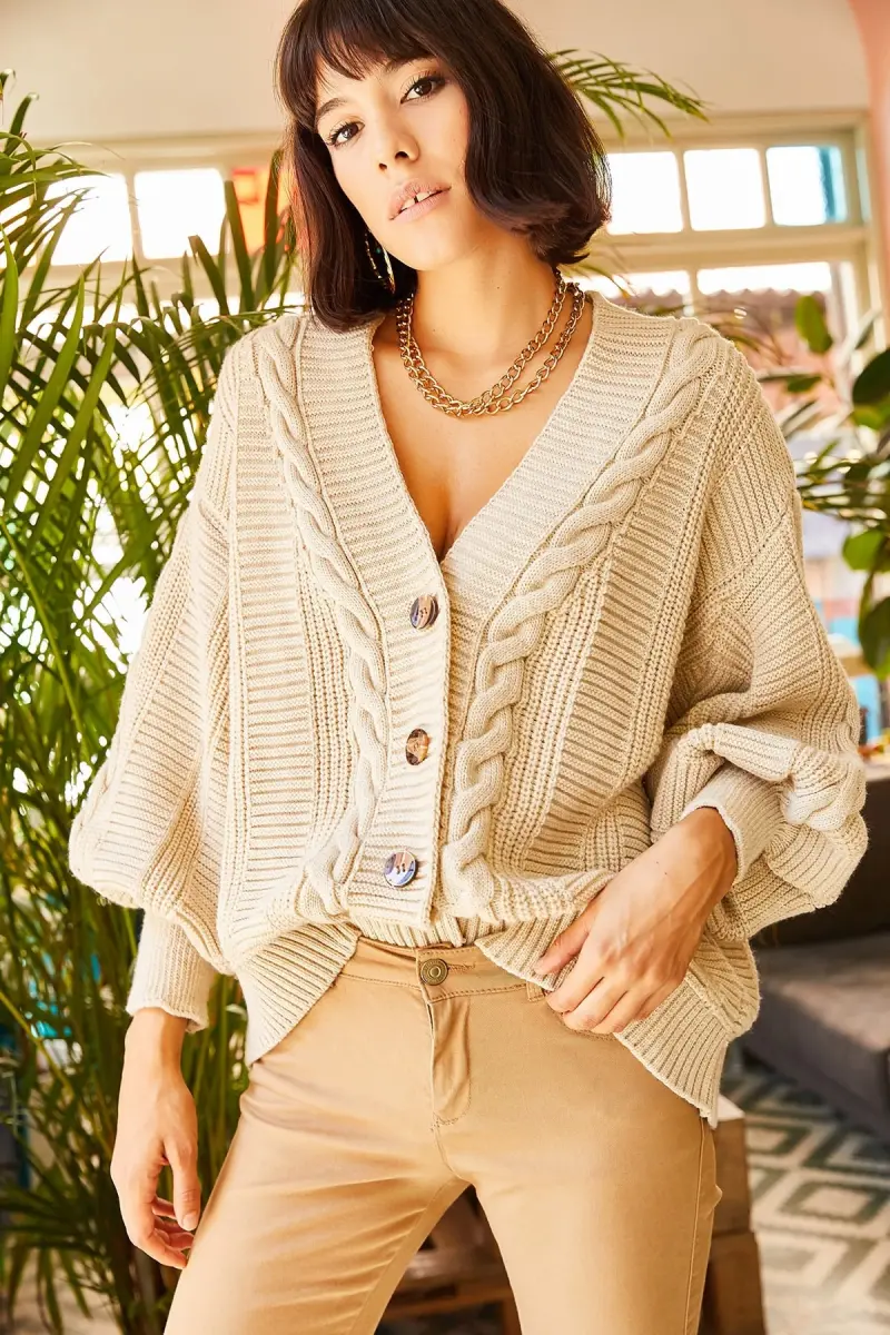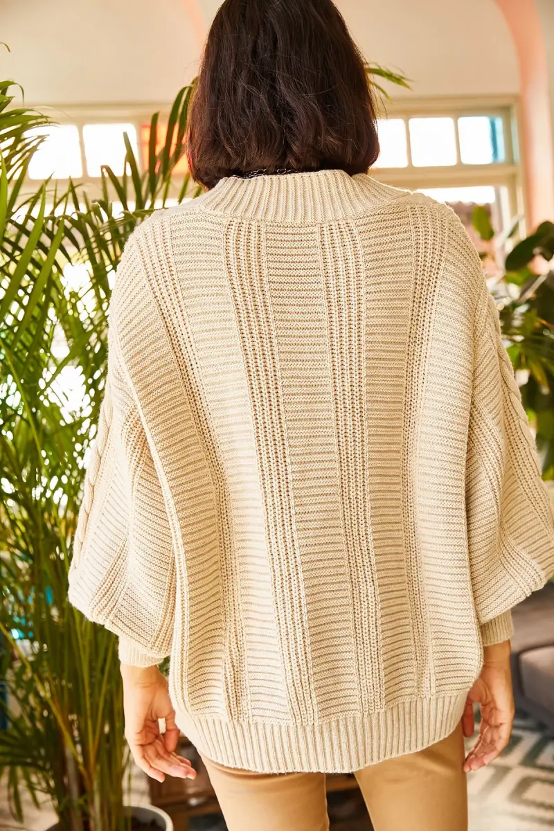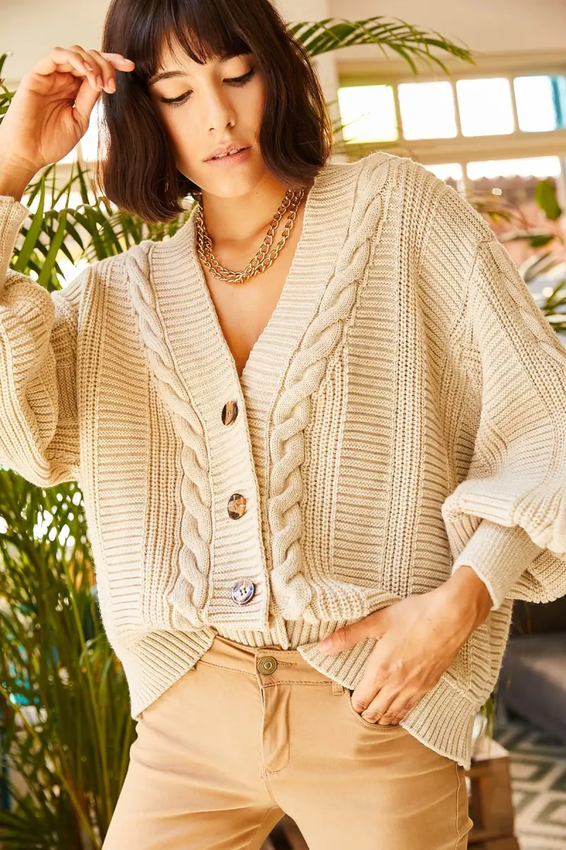 Kadın Taş Kalın Saç Örgülü Triko Hırka HRK-19000082-Taş