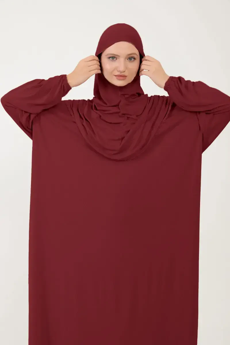 Kadın Tesettür Pamuklu Başörtülü Namaz Elbisesi, modern tesettür giyim anlayışıyla tasarlanmış, hem rahatlığı hem de şıklığı bir arada sunan özel bir üründür. İbadetlerinizi yerine getirirken konforunuzu en üst düzeye çıkarmayı hedefleyen bu tek parça elbise, pratik kullanımıyla da günlük hayatınızda size kolaylık sağlar. Başörtüsü ile bütünleşik tasarımı, zamandan tasarruf etmenizi ve her zaman hazır olmanızı mümkün kılar. Bordo rengin derinliği ve asilliği, elbiseye ayrı bir hava katarken, dantel detayları da zarafetinizi ön plana çıkarır. Özellikle penye kumaşın sunduğu yumuşak dokunuş, gün boyu rahat etmenizi sağlar. Bu elbise, sadece namaz kılarken değil, aynı zamanda ev içinde veya misafir ağırlarken de tercih edebileceğiniz çok yönlü bir parçadır. Kendine özen gösteren, şıklığından ödün vermek istemeyen tesettürlü kadınlar için ideal bir seçimdir. Ürünün kumaş kalitesi, uzun ömürlü kullanım imkanı sunarken, kolay ütülenebilir özelliği de pratikliğini artırır. Tesettür modasının en güncel trendlerini yansıtan bu elbise, gardırobunuzun vazgeçilmez parçalarından biri olmaya adaydır. Her detayı özenle düşünülmüş bu tasarım, hem modern hem de geleneksel çizgileri bir araya getirerek, her tarza hitap etmeyi başarır. İster günlük kullanımda ister özel günlerde, her zaman şık ve rahat hissetmenizi sağlayacak bu özel namaz elbisesi, tesettür giyimde yeni bir soluk getiriyor.