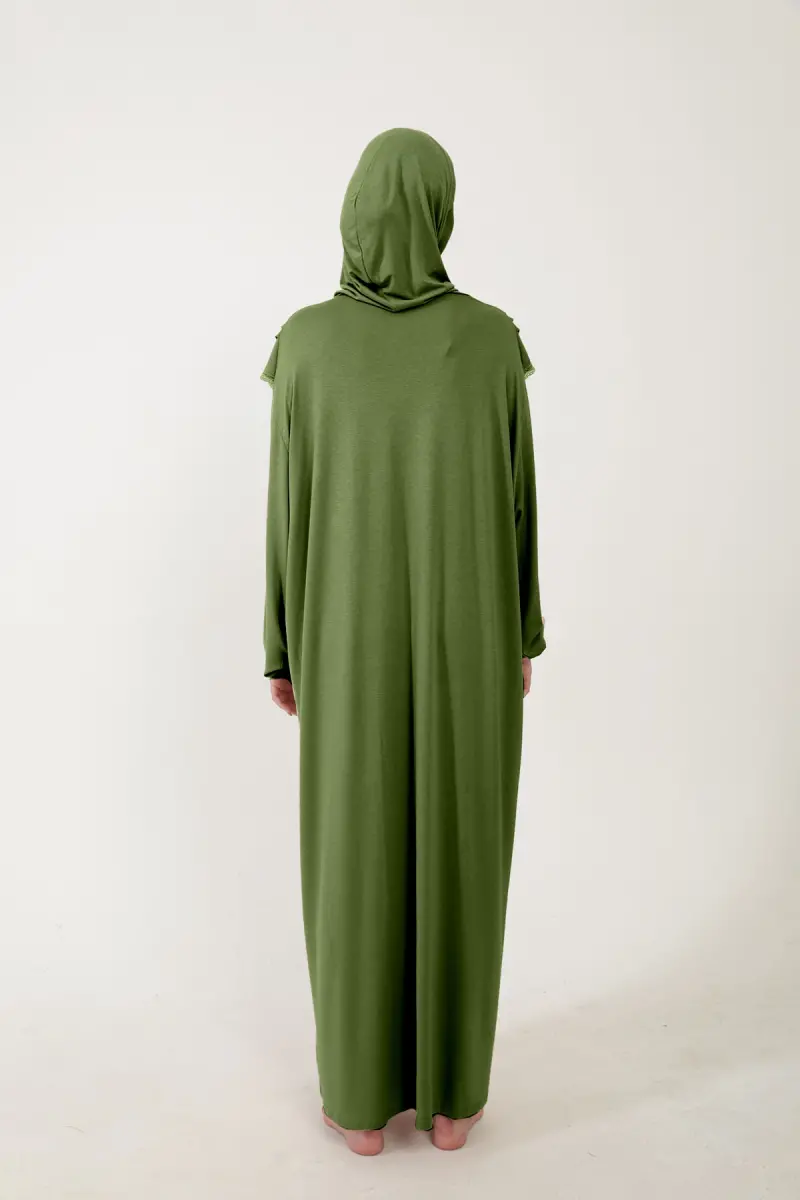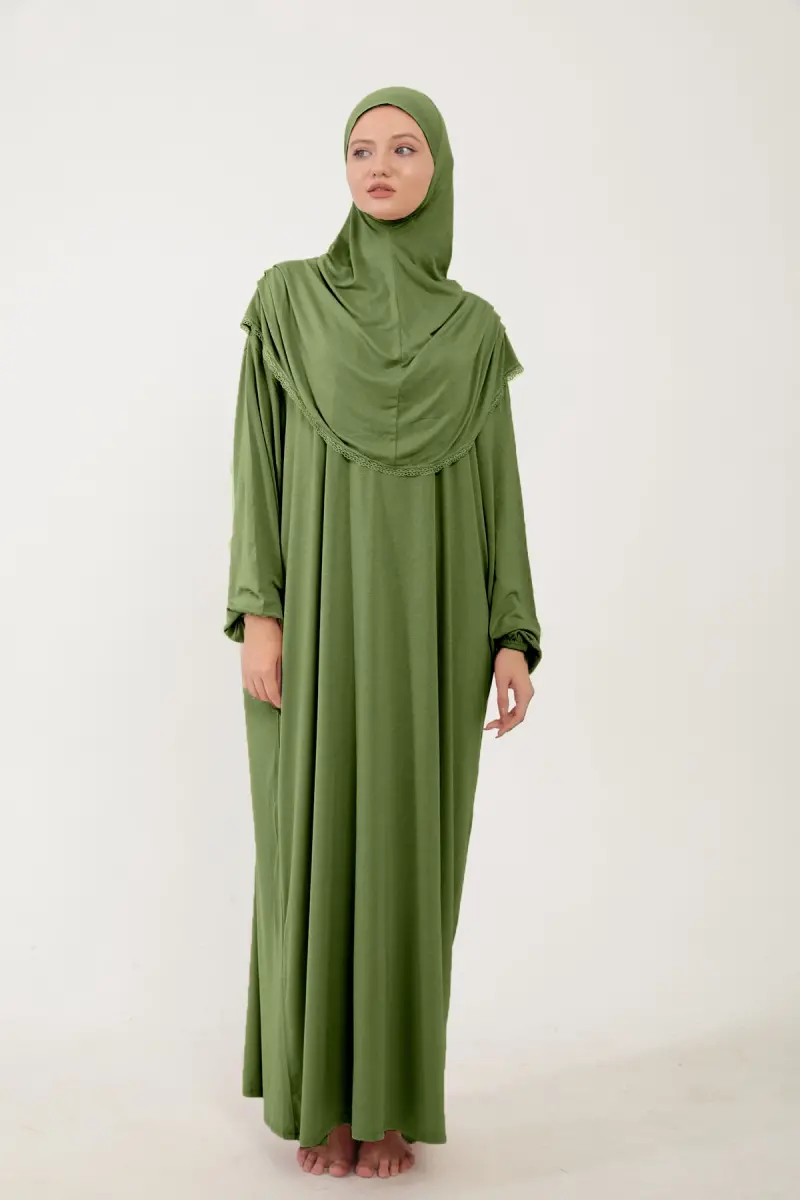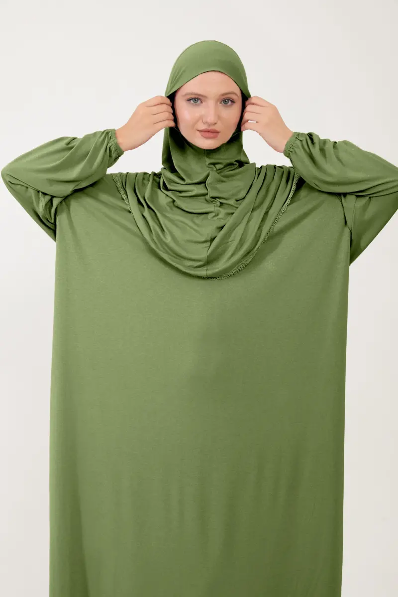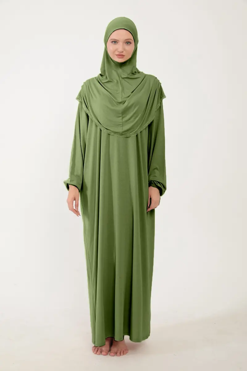 Kadın Tesettür Pamuklu Başörtülü Namaz Elbisesi Dantelli Tek Parça Penye Kumaş-Fıstık Yeşili