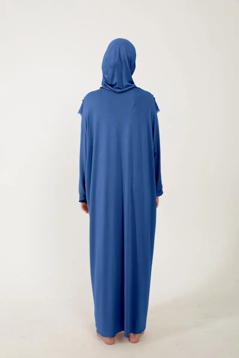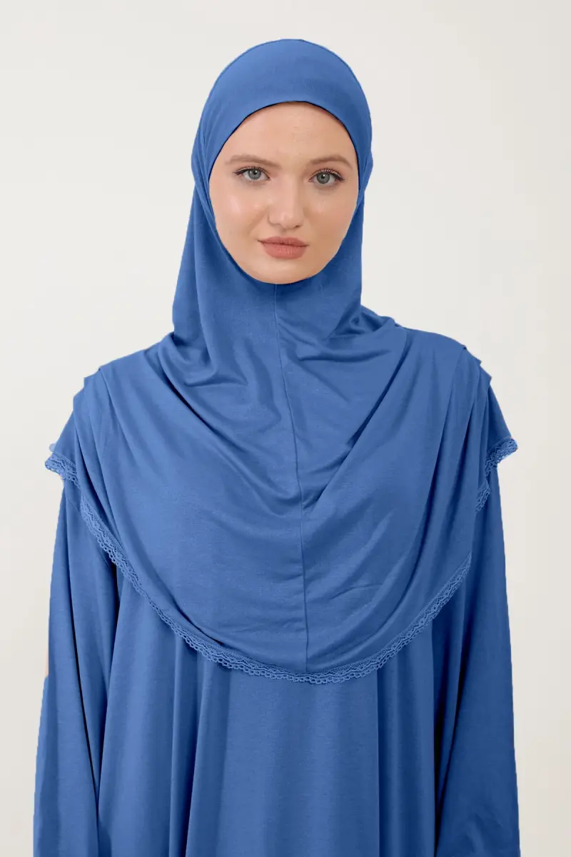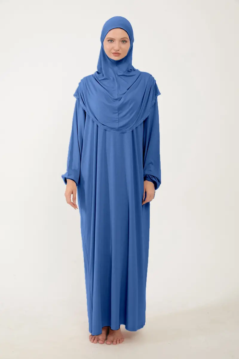 Kadın Tesettür Pamuklu Başörtülü Namaz Elbisesi Dantelli Tek Parça Penye Kumaş-Kot rengi