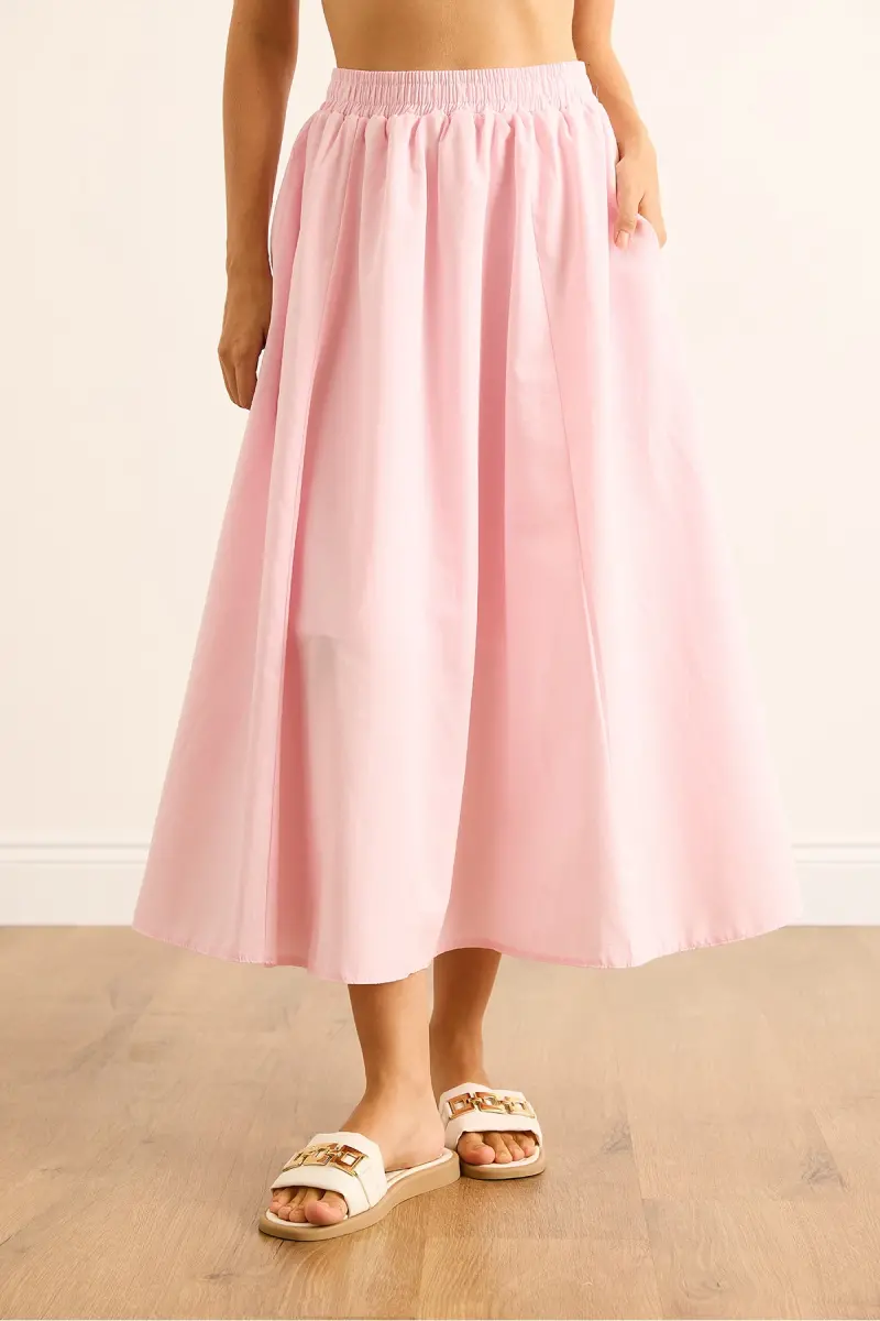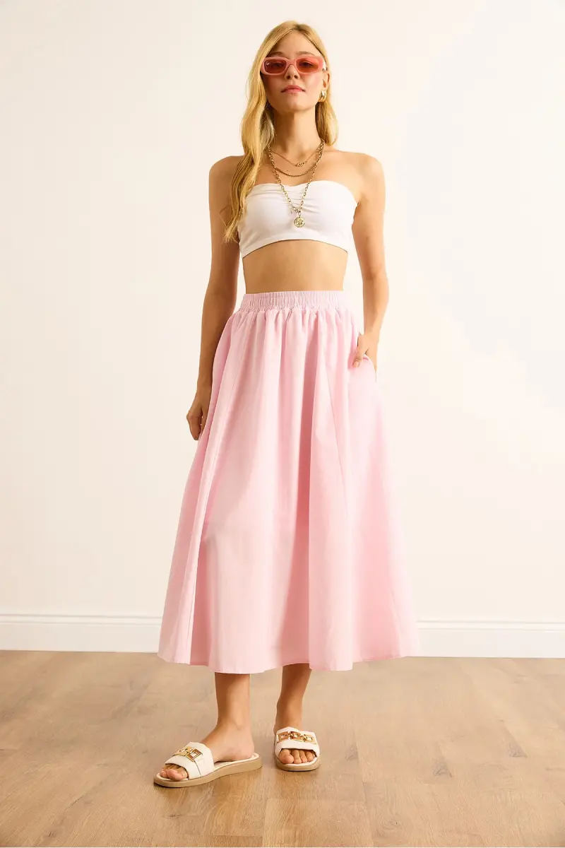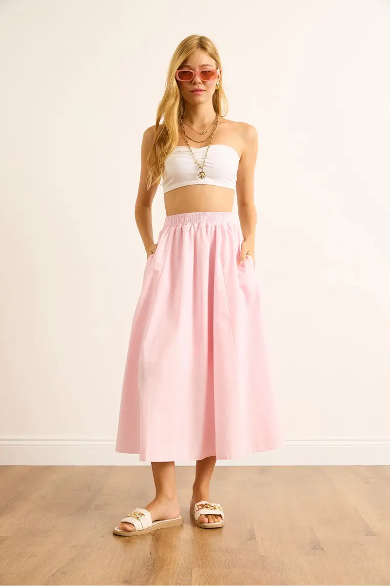 Kadın Toz Pembe Cepli Beli Lastikli Midi Dokuma Çan Etek ETK-19000271-Toz Pembe