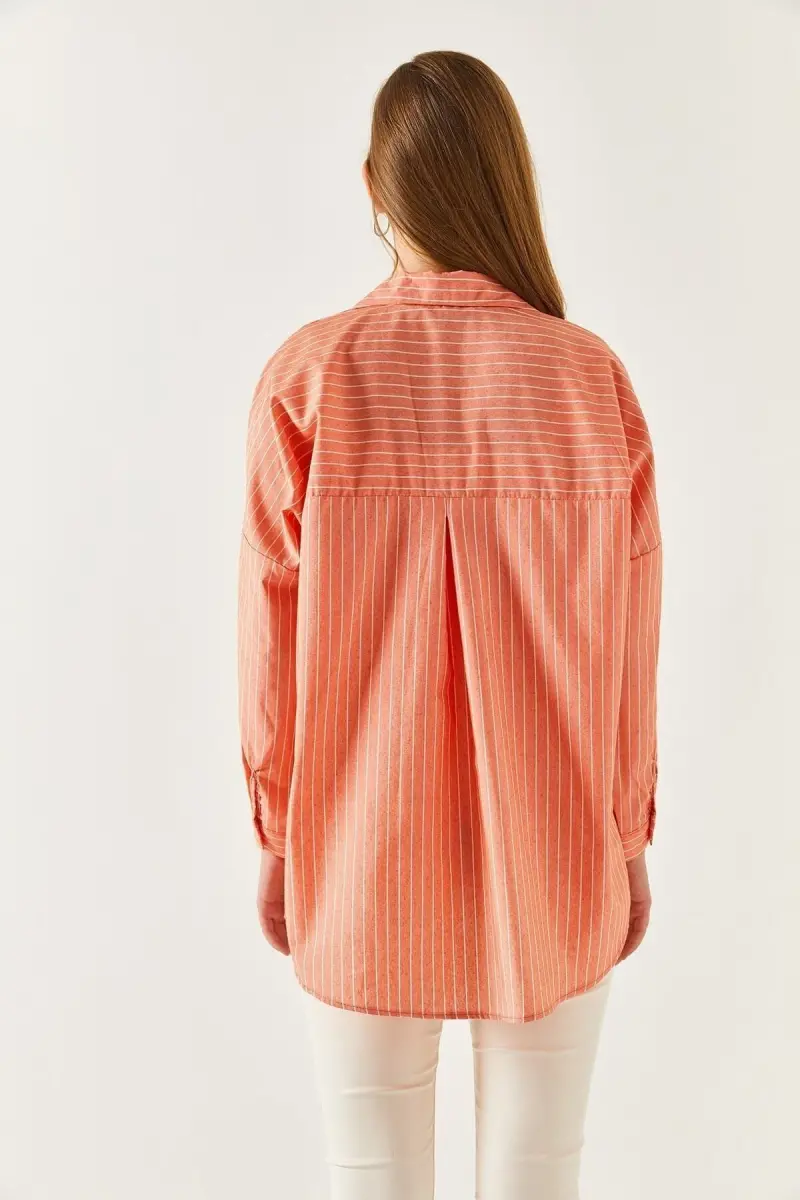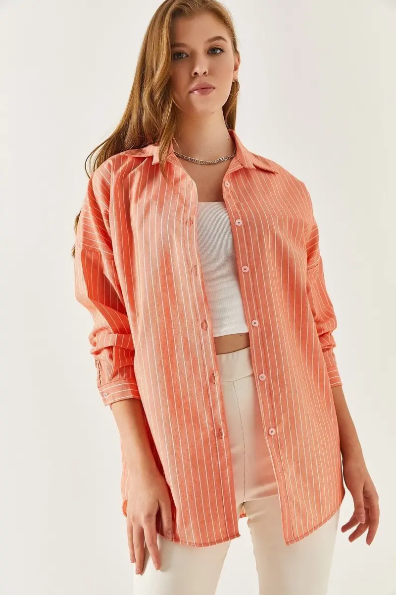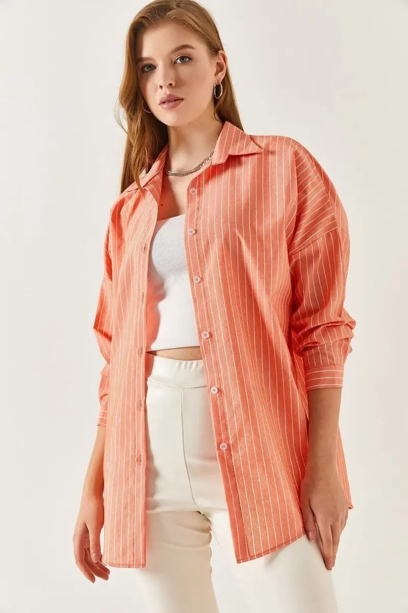 Kadın Turuncu İnce Çizgili Oversize Uzun Basic Gömlek Arm-22Y001185-Turuncu