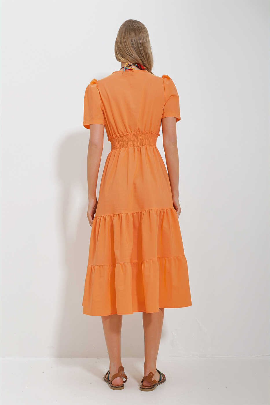 Turuncu rengi ile dikkat çeken elbise, farklı tarzlara uyum sağlayabilir. Günlük kullanım için spor ayakkabılarla kombinleyebilir, akşam yemekleri için ise şık topuklu ayakkabılarla tamamlayabilirsiniz. Elbisenin belindeki kuşak, silüetinize vurgu yaparak sizi daha da zarif göstermenizi sağlar.