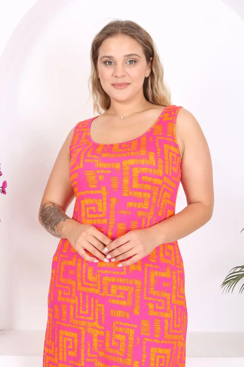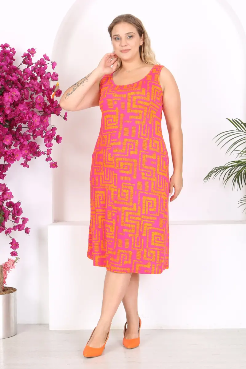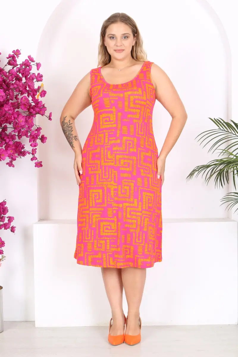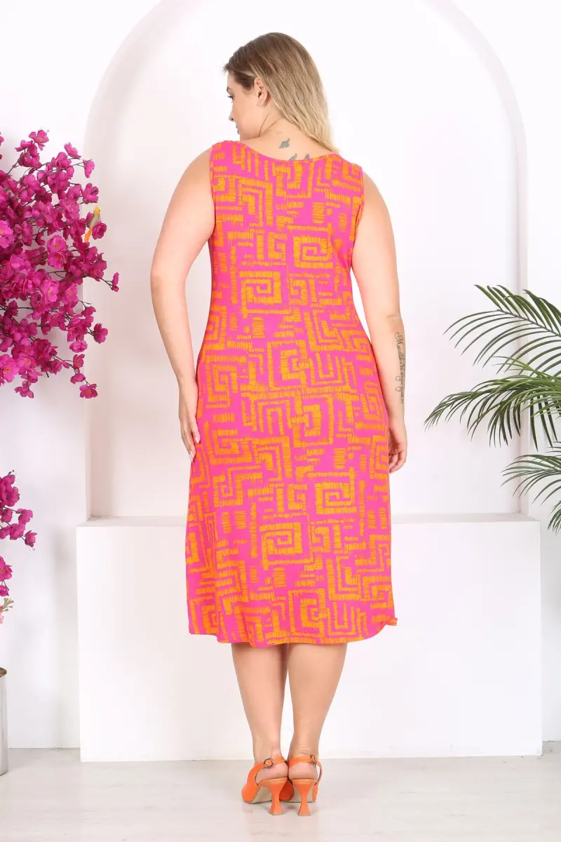 Kadın Turuncu Pembe Labirent Desenli Büyük Beden Askılı Elbise-Turuncu Pembe