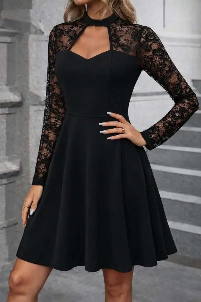 Kadın Uzun Kollu Balıkçı Yaka Dantelli Ithal Krep Kısa Kiloş Elbise