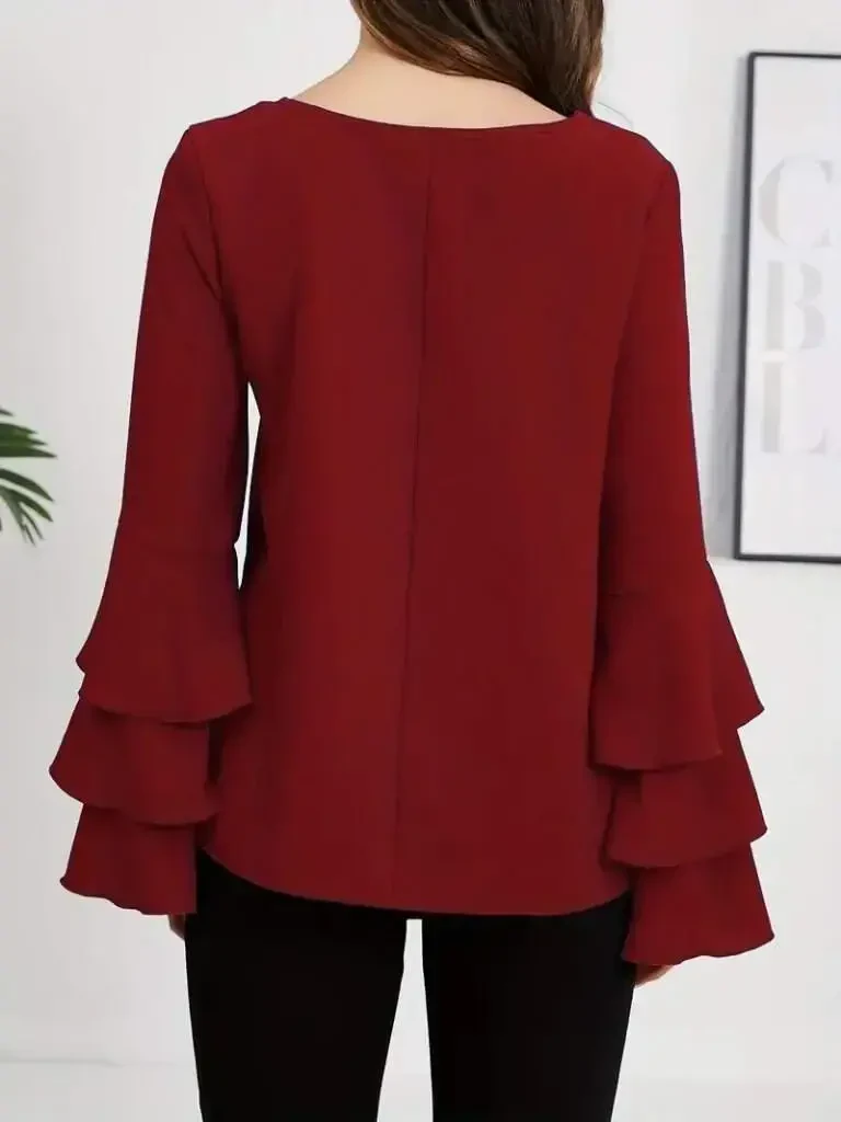 Kadın bluz, uzun kollu, bisiklet yaka, ispanyol volanlı, sandy kumaş, klasik kalıp, volan detaylı, şık bluz, rahat bluz, günlük bluz