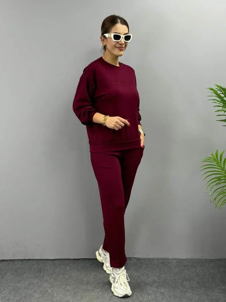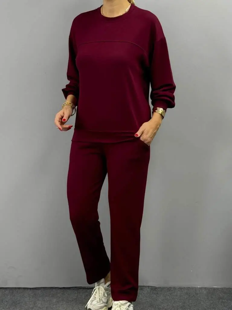 Kadın Uzun Kollu Bisiklet Yaka Viskon Iki Iplik Bluz Ve Pantolon Ikili Takım