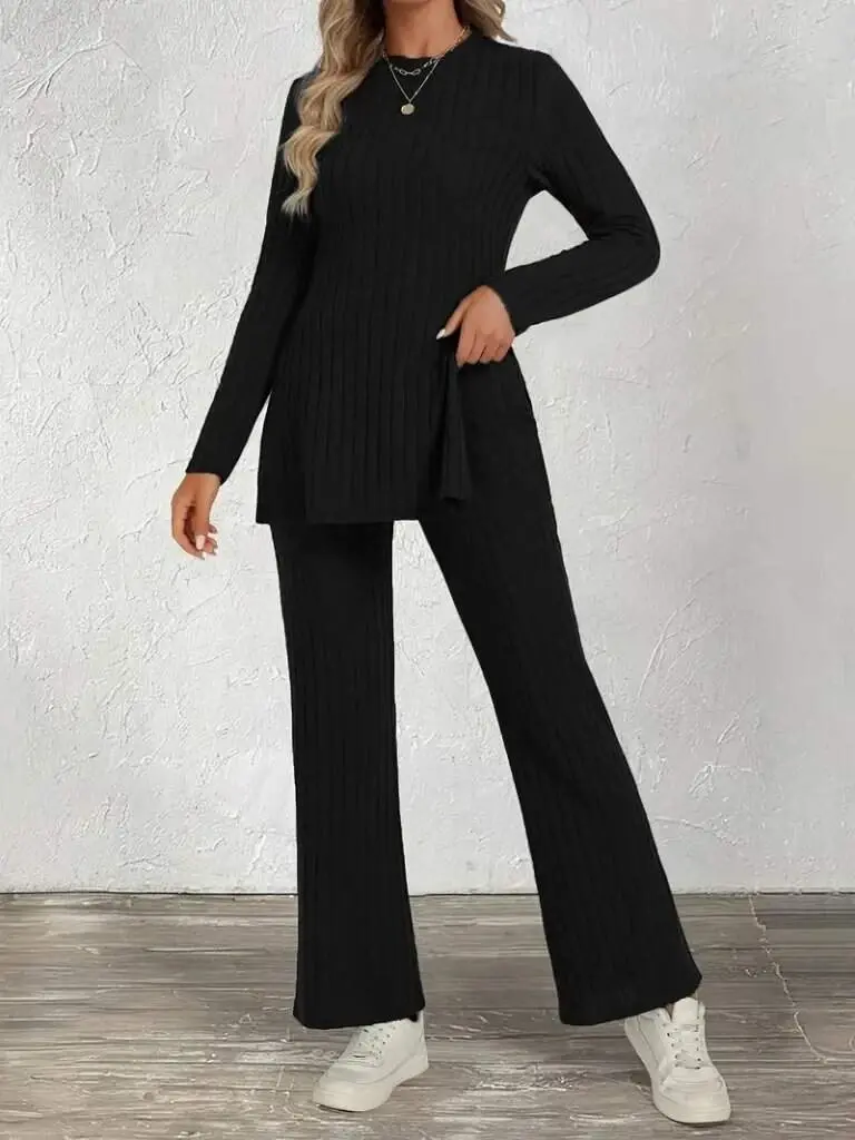 Kadın Uzun Kollu Bisiklet Yaka Yandan Yırtmaçlı şardonlu Kaşkorse Bluz Ve Pantolon Ikili Takım