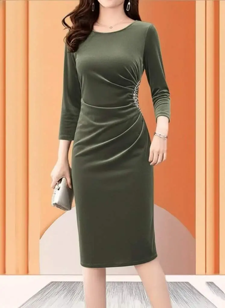 Kadın Uzun Kollu Bot Yaka Yanı Taş Detaylı Midi Kadife Elbise