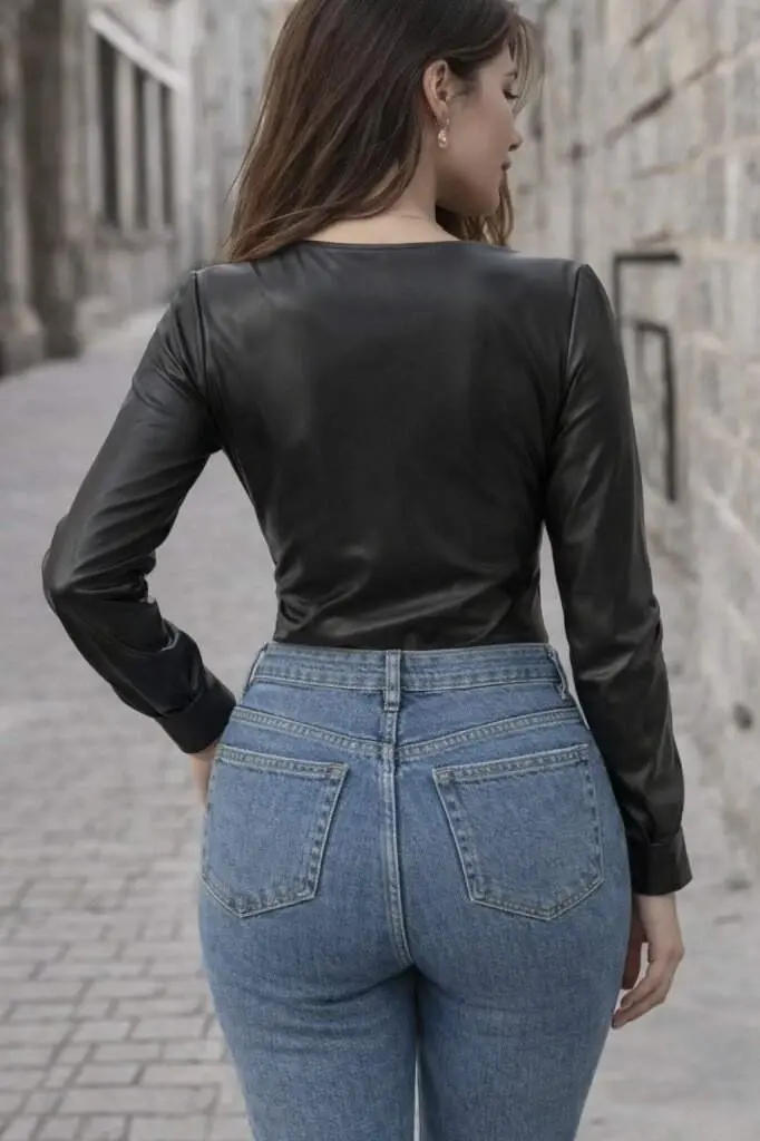 Add a bold and modern touch to your style with the Women's Long Sleeve Deep V Neck Leather Bodysuit. This striking bodysuit combines elegance and comfort, making it a must-have piece in your wardrobe. Made from high-quality faux leather material, this bodysuit offers both an eye-catching look and long-lasting use. The deep V-neckline highlights your femininity, while the long sleeves make it a comfortable choice even in cool weather.The bodysuit's form-fitting cut perfectly accentuates your silhouette, creating a stylish and attractive look. Its flexible structure does not restrict your freedom of movement throughout the day and offers a comfortable wearing experience. The snap closure at the bottom of the bodysuit makes it easy to put on and take off, while also ensuring that your outfit stays in place all day long.This bodysuit can be easily paired with different combinations. You can combine it with jeans or skirts for everyday chic, or complete it with a stylish skirt and heels for a special occasion to create a dazzling look. You can reflect your personal style with your accessories and make a difference in any environment.The Women's Long Sleeve Deep V Neck Leather Bodysuit allows you to reflect your style and helps you feel confident and free. You can always be stylish and assertive with this special piece that should definitely be in your wardrobe. Discover this bodysuit now to take your style to the next level and attract attention.This bodysuit not only offers a stylish look, but also maintains its place in your wardrobe for many years thanks to its quality material and workmanship. Thanks to its design in line with fashion trends, it ensures that you are always up-to-date and stylish. Choose this leather bodysuit to feel special and express your style in the best way.