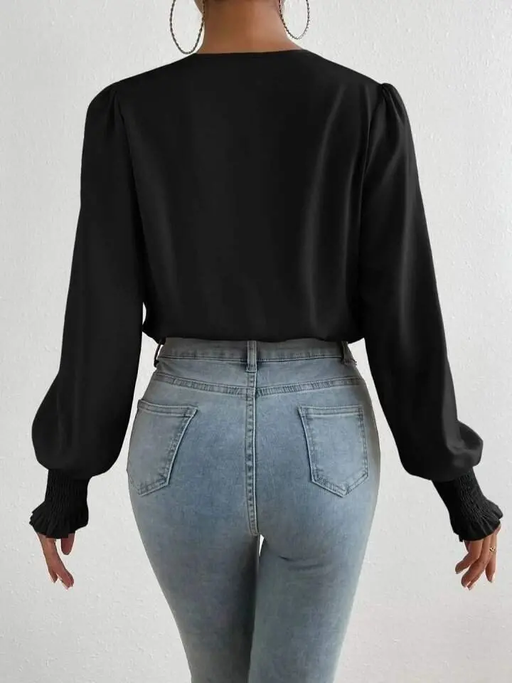 Kadın Uzun Kollu Dökümlü Kruvaze Yaka Kol Ucu Gipeli Sandy Bluz
