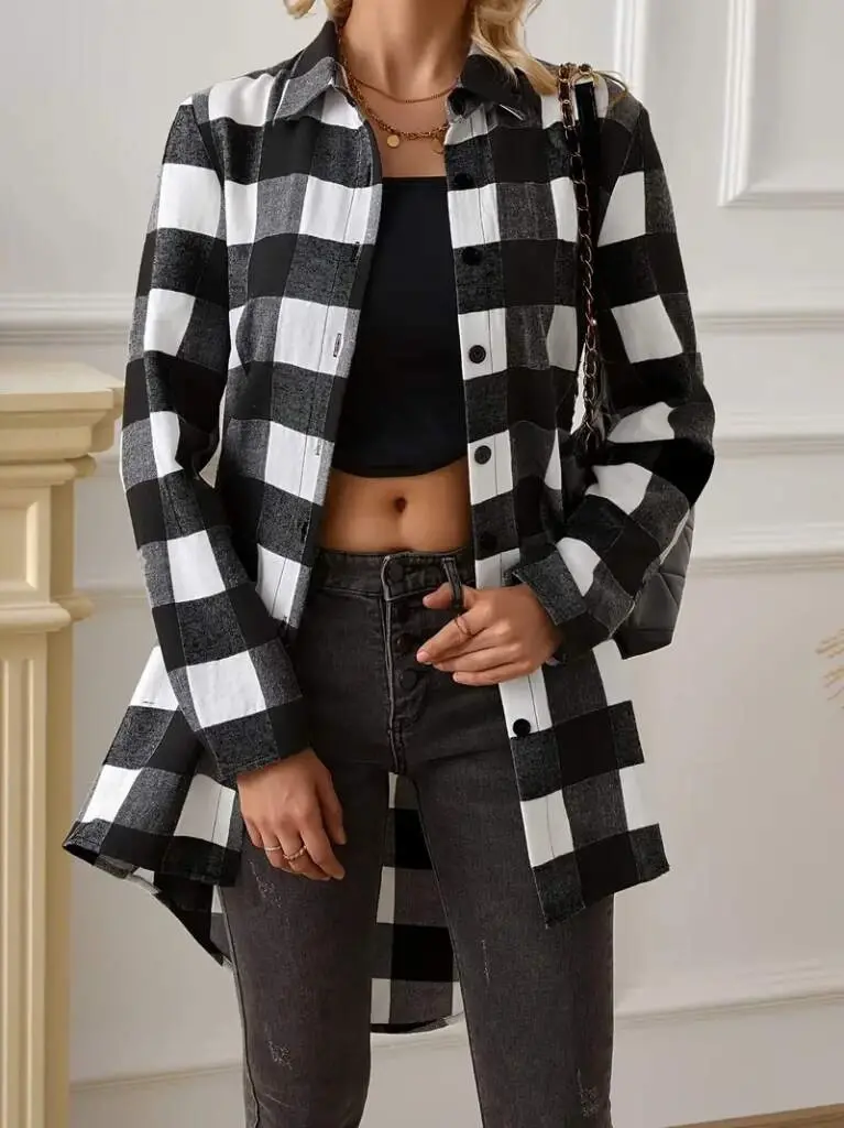 Kadın Uzun Kollu Ekoseli önden Düğmeli Dokuma Uzun Gömlek