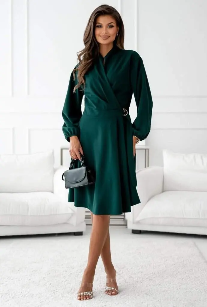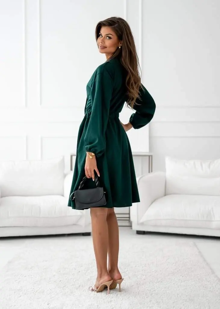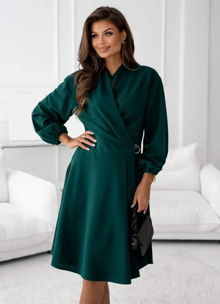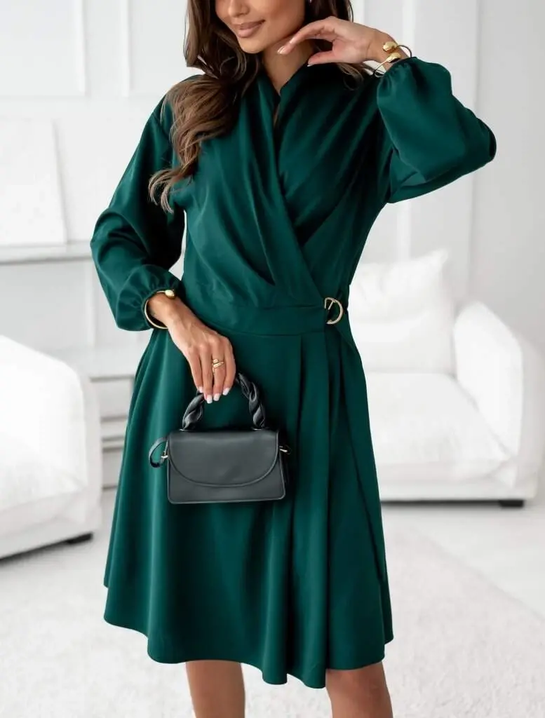 Kadın Uzun Kollu Hakim V Yakalı Yandan Toka Detaylı Ithal Mini Krep Elbise