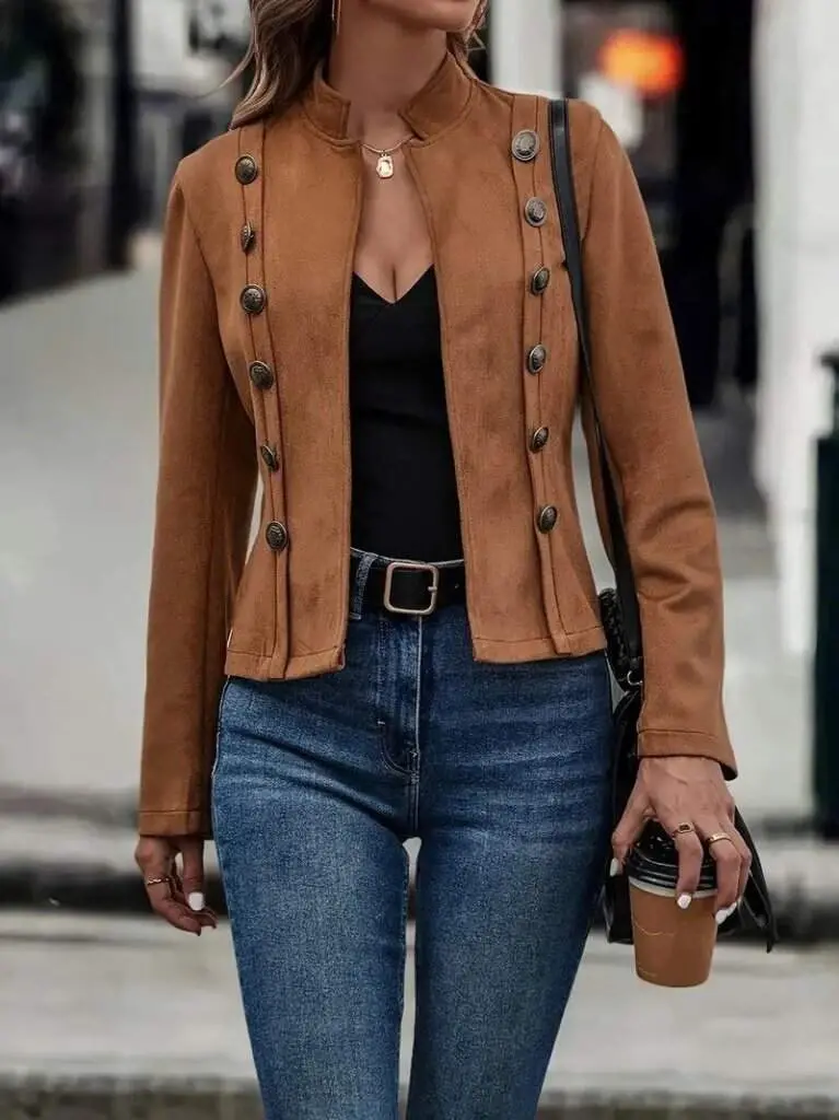Kadın Uzun Kollu Hakim Yaka Yanlardan Düğmeli Kısa Süet Ceket