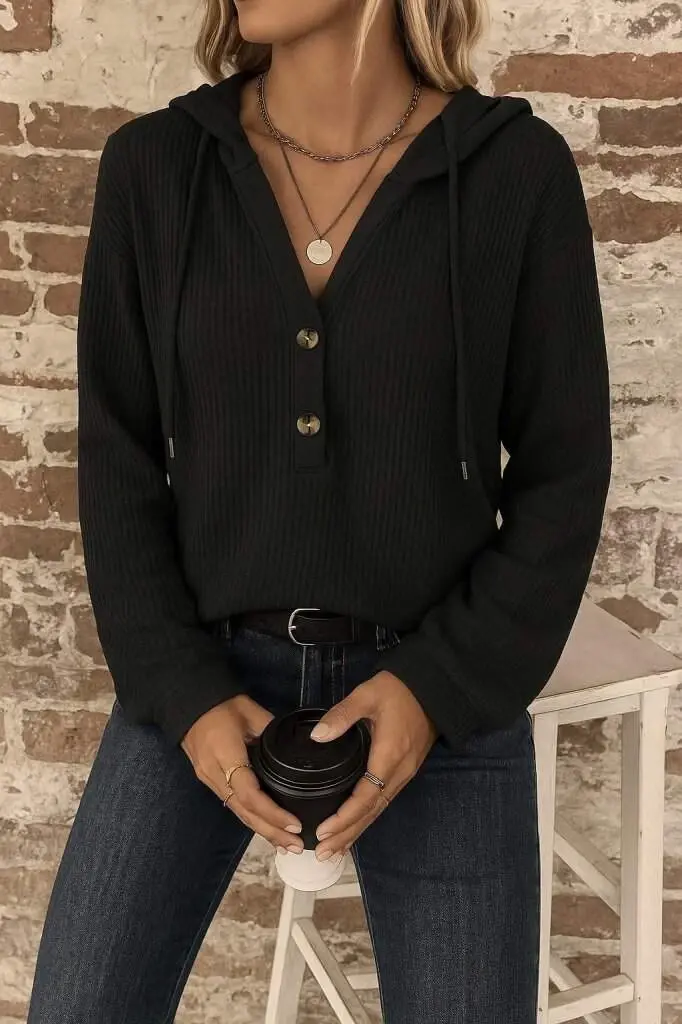 Kadın Uzun Kollu Kapşonlu önü Düğmeli Ve Bağcıklı Waffle Bluz