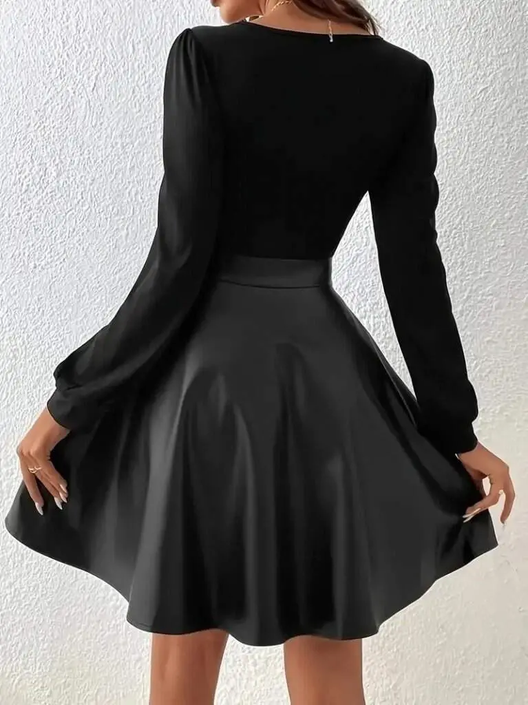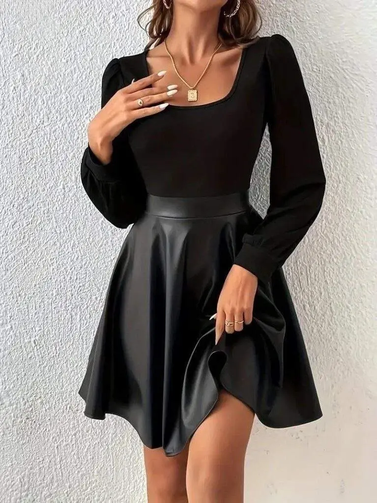 Kadın Uzun Kollu Kare Yaka üst Viskon Alt Deri Mini Elbise