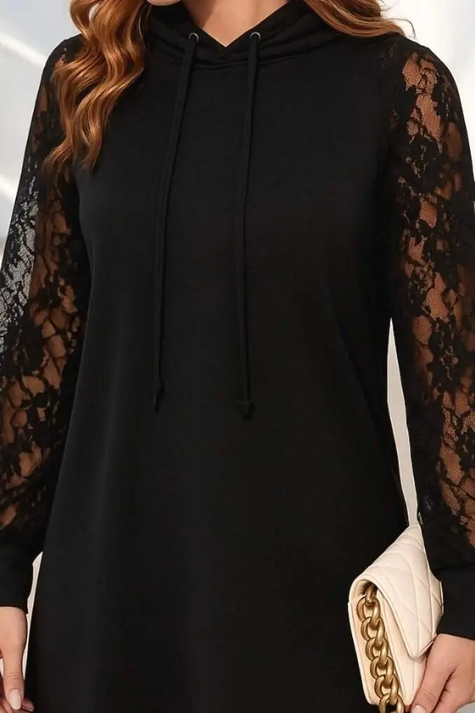 Kadın Uzun Kollu Kolları Dantel Detaylı Kapşonlu Bağcıklı Kısa Viskon Iki Iplik Elbise