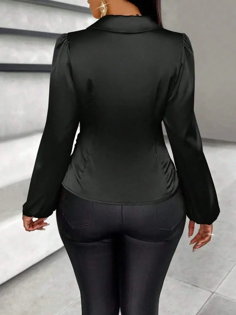 Kadın Uzun Kollu Kruvaze Yakalı Asimetrik Saten Bluz