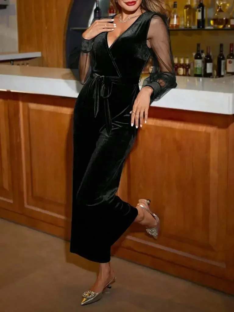Ayollar kruvaze yoqali baxmal kombinezon | To'r detallari bilan zamonaviy dizayn