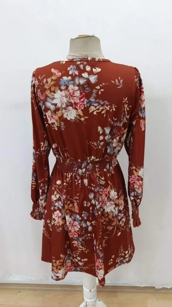 Kadın Uzun Kollu Kruvaze Yakalı çiçek Desenli Mini Süprem Elbise