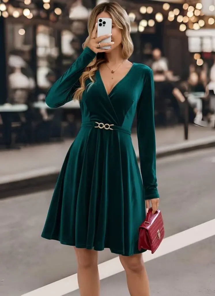 Kadın Uzun Kollu Kruvaze Yakalı Toka Detaylı Mini Kadife Elbise