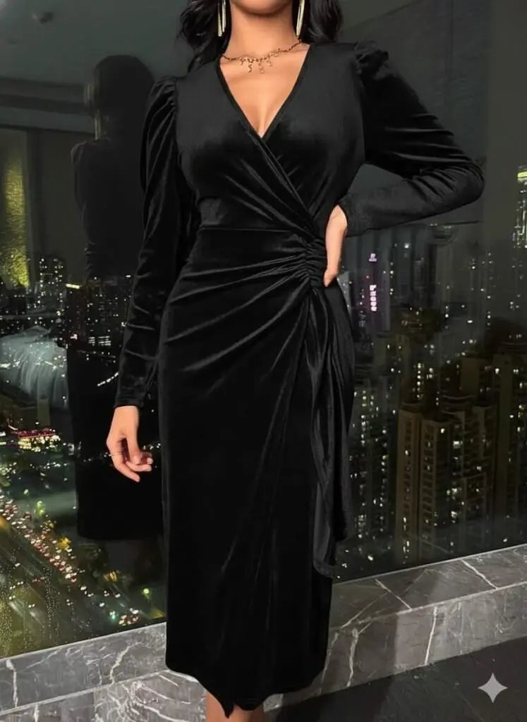 Kadın Kruvaze Yaka Büzgülü Kadife Midi Elbise | Şık ve Rahat Tasarım