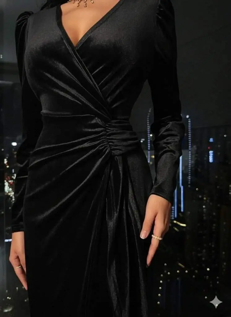 Kadın elbise, uzun kollu, kruvaze yaka, midi boy, kadife elbise, yandan büzgülü, şık elbise, konforlu elbise, özel tasarım, feminen elbise