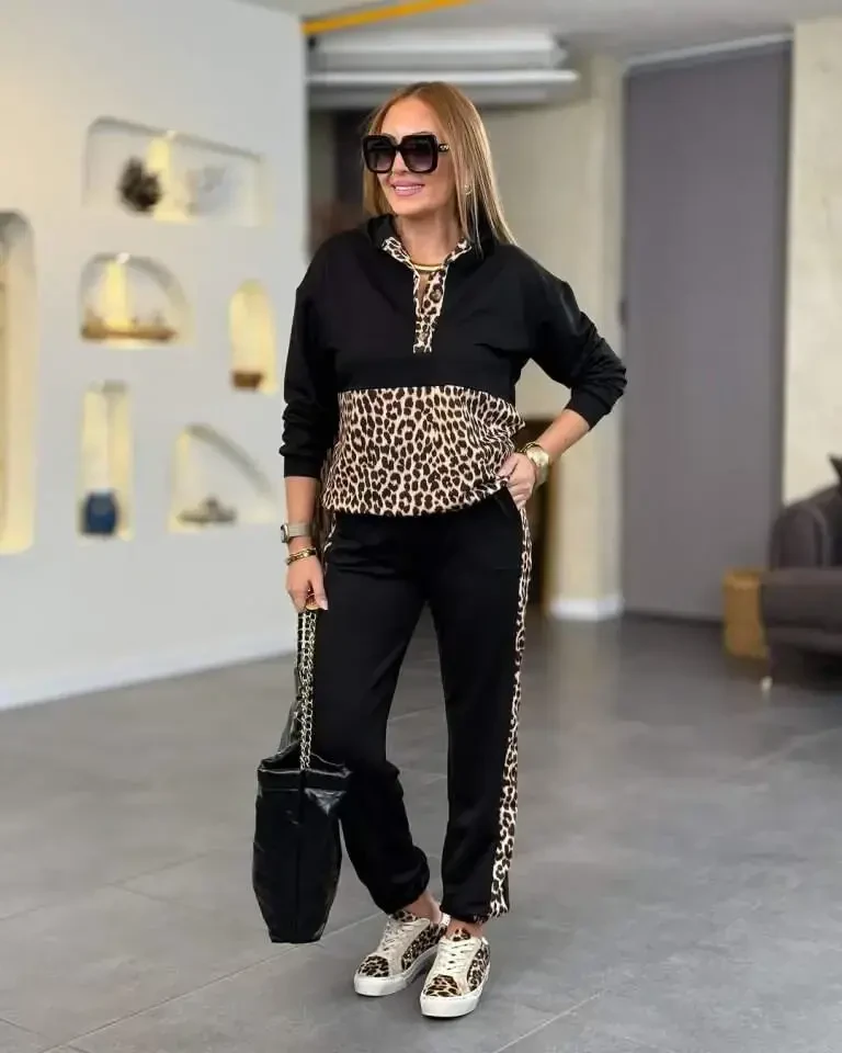 Reflect your style with the Women's Long Sleeve Leopard Detail Sweatshirt and Side Leopard Stripe Detail Pants Set, which offers elegance and comfort together! This unique design will accompany you in both daily use and special moments. The modern interpretation of the leopard pattern and stripe details add a dynamic touch to the set, while its comfortable fabric ensures you feel comfortable all day long. Whether you are relaxing at home or meeting up with friends, this set will make you stand out in any environment.The long-sleeved sweatshirt, the top piece of the set, is enlivened with leopard details and offers a modern and stylish look. Thanks to its comfortable cut, it offers a comfortable wearing experience throughout the day. The bottom piece, on the other hand, completes the set with leopard stripe details on the sides and makes your legs look longer. The elasticated waistband of the trousers provides a perfect fit to your body and does not restrict your freedom of movement.This two-piece set is a candidate to be an indispensable part of your wardrobe. You can personalize your style by creating different combinations. For example, you can create a casual style with sneakers, or a more elegant look with heels. You can also complete the set with your accessories and create combinations that bear your own signature.Model Measurements: Height: 165 cm, Weight: 55 kg, Chest: 90 cm, Waist: 72 cm, Hips: 100 cm. The product worn by the model is size M/38. These measurements will help you choose the correct size. By choosing the one that suits your size best, you can ensure that the team looks perfect on you. Remember, the right size selection directly affects the stance of the garment and your comfort.Offering long-lasting use thanks to its quality fabric, this set is easy to wash and iron. In this way, you both save time and always look well-groomed and stylish. Leopard pattern and stripe details do not fade after washing and retain their vibrancy as on the first day. This means that the team will remain in your wardrobe for many years.This stylish and comfortable two-piece set is both a great gift option for yourself and a meaningful gift you can give to your loved ones. This set, which is a perfect choice for birthdays, anniversaries or special occasions, will make your loved ones happy and add a stylish touch to them. Let them also experience the comfort and elegance of this unique set.Be stylish and enjoy comfort with the Women's Long Sleeve Leopard Detail Sweatshirt and Side Leopard Stripe Detail Pants Set! This unique design will be the most loved piece of your wardrobe and will give you energy every time you wear it. Order now and start reflecting your style!