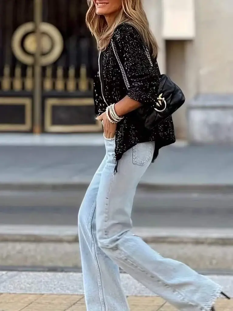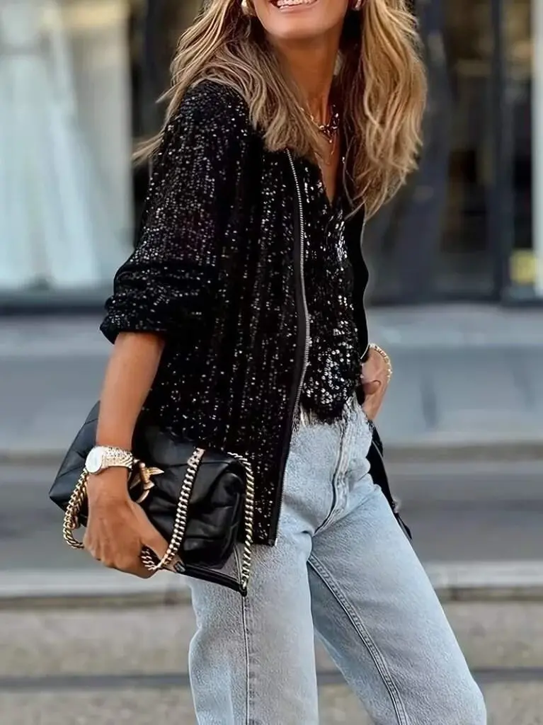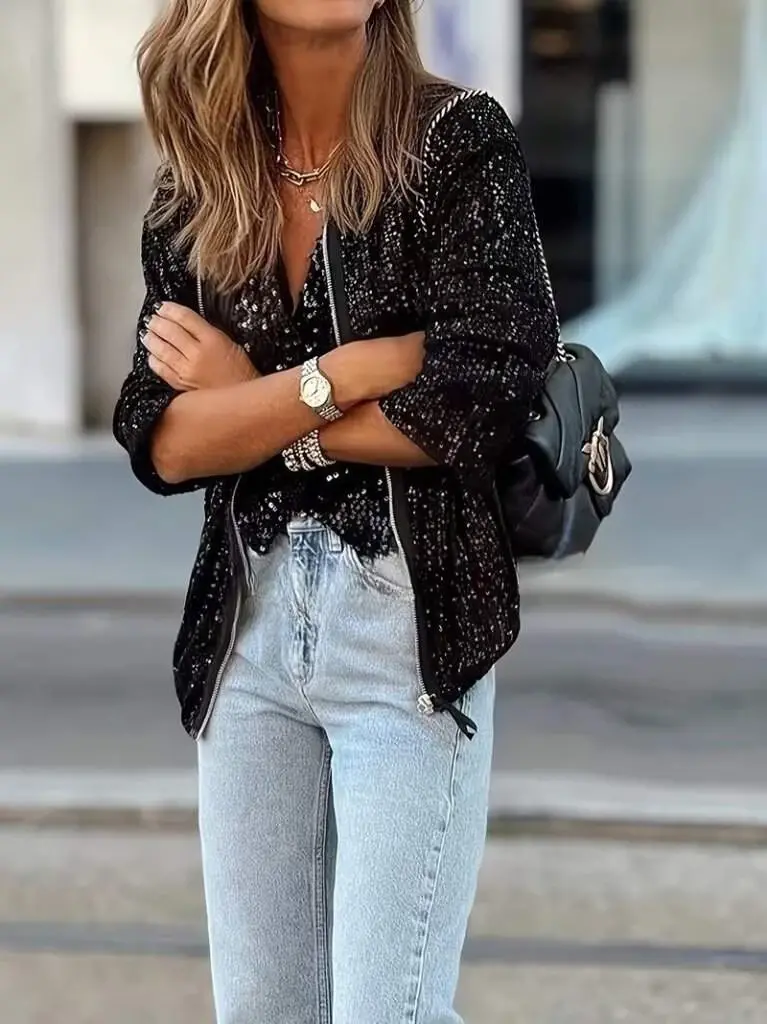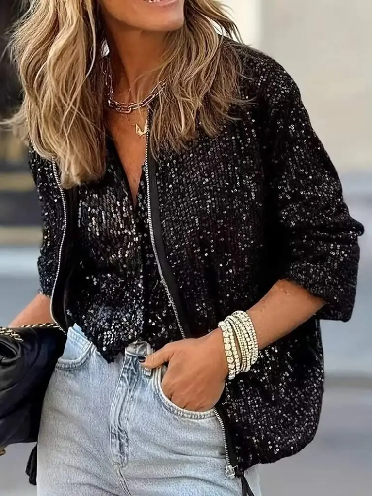 Kadın Uzun Kollu önü Fermuarlı Kısa Pulpayet Ceket