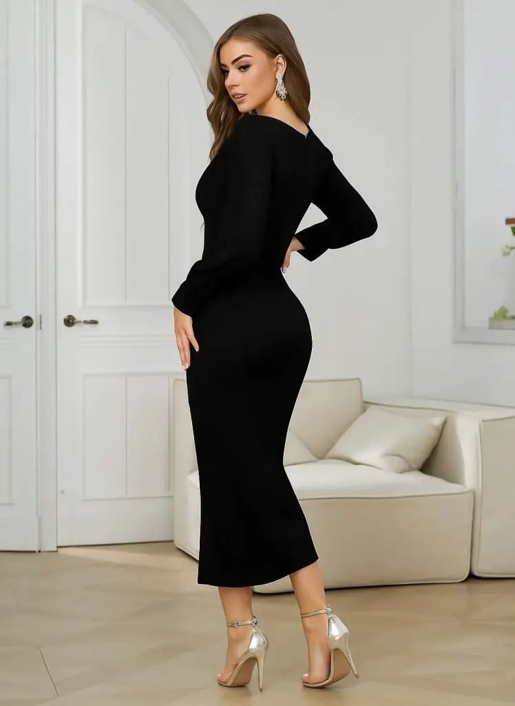 Kadın Uzun Kollu V Yakalı Yırtmaçlı Taşlı Uzun Ithal Krep Elbise