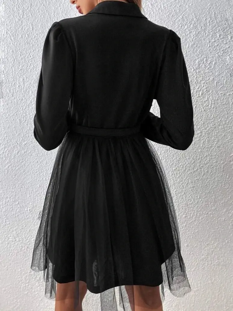 Tüllü Krep Mini Elbise | Uzun Kollu, Yakalı ve Kemerli Şık Tasarım