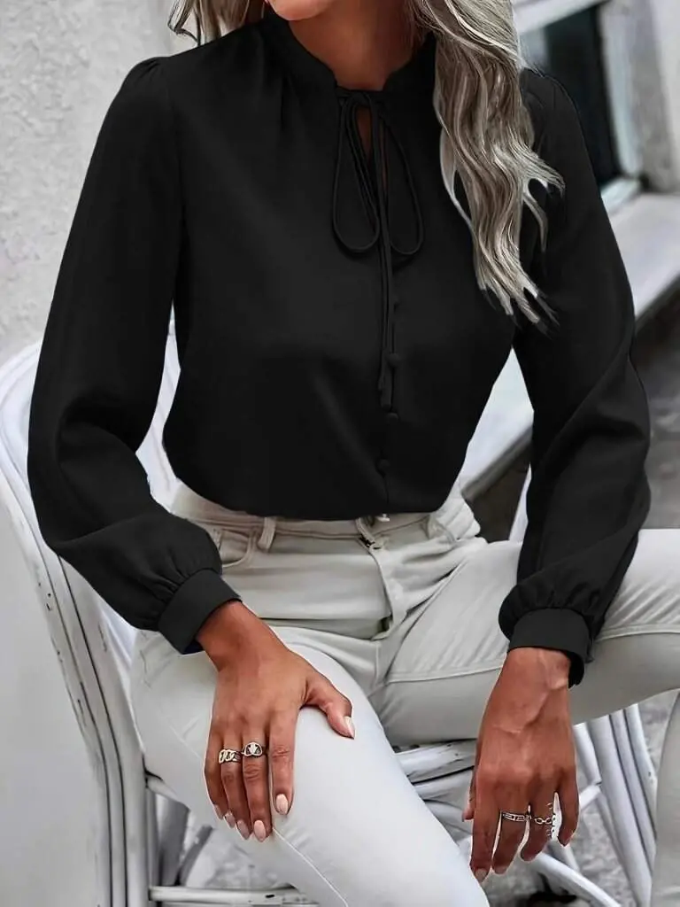 Kadın Uzun Kollu Yakalı Yakadan Bağcıklı Düğmeli Sandy BluzModelin Ölçüleri: Boy: 165, Kg: 55, Göğüs: 90, Bel: 72, Kalça: 100Modelin üzerindeki ürün M/38 bedendirDESEN-DiğerleriKALIP-Klasik