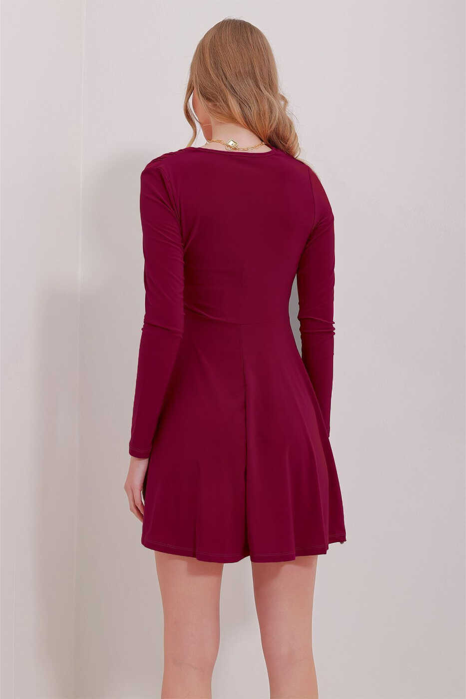 Женское фиолетовое платье с асимметричным воротником, драпировкой и расклешенным подолом ALC-X11496 - идеальный выбор для женщин, которые ищут элегантность и комфорт одновременно. Вы можете создавать разные стили, сочетая платье с туфлями на высоком каблуке, шпильками, сандалиями или кроссовками.