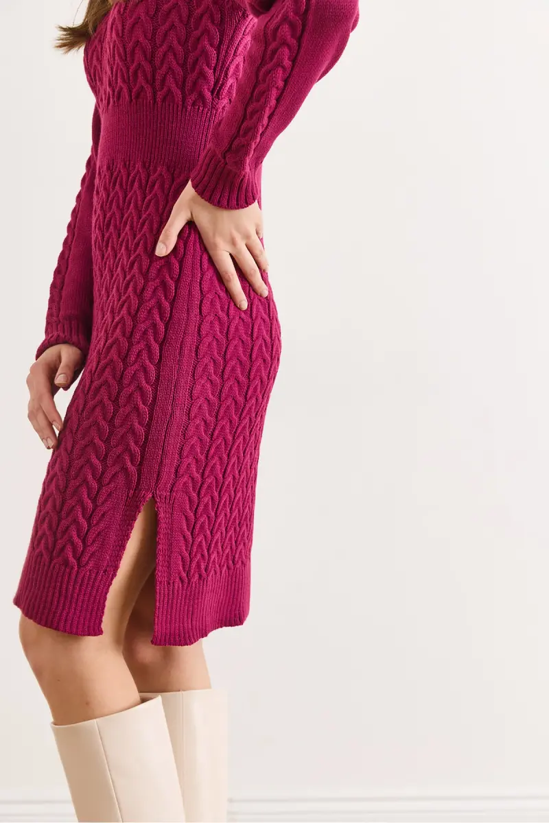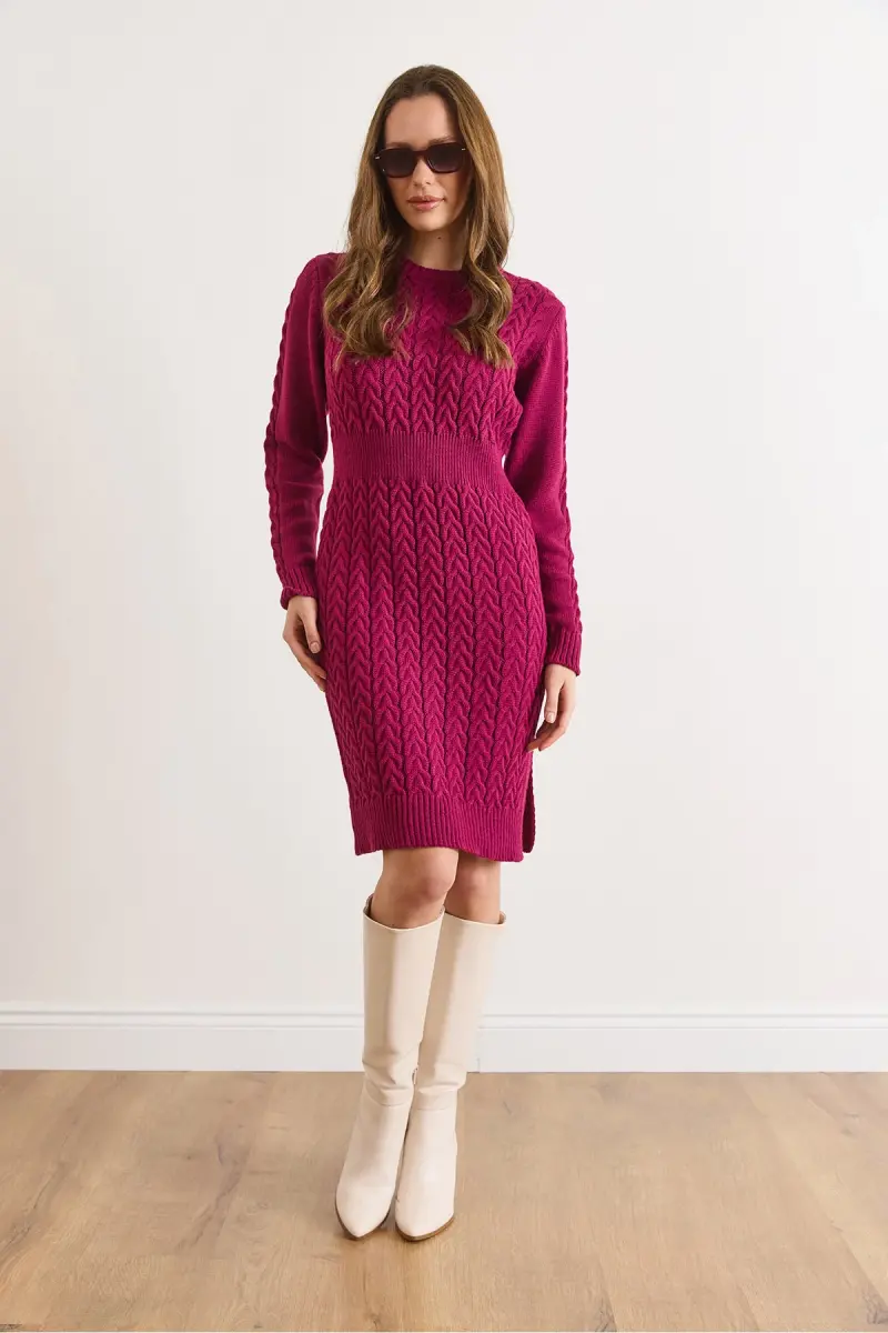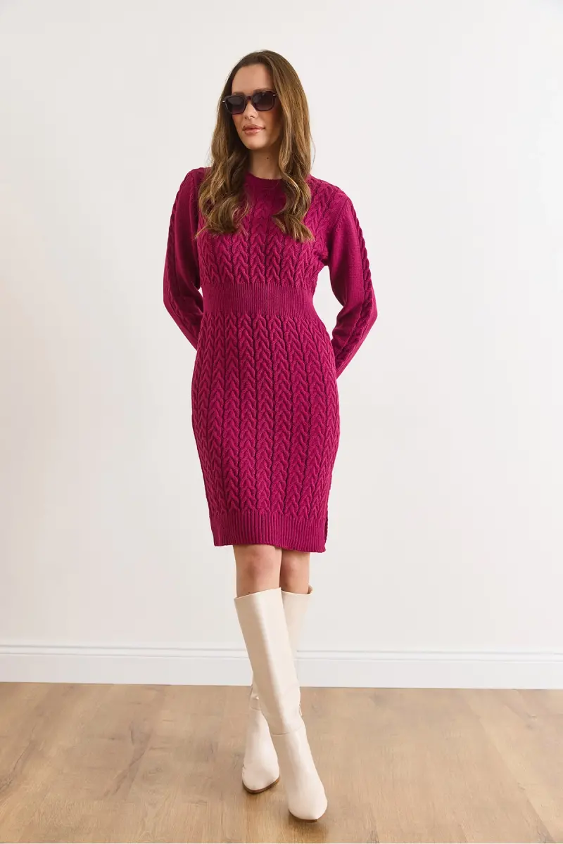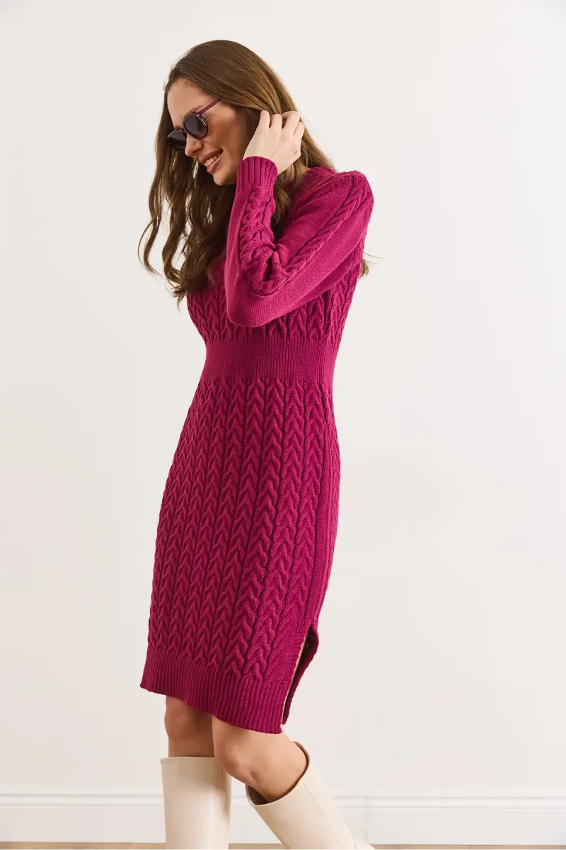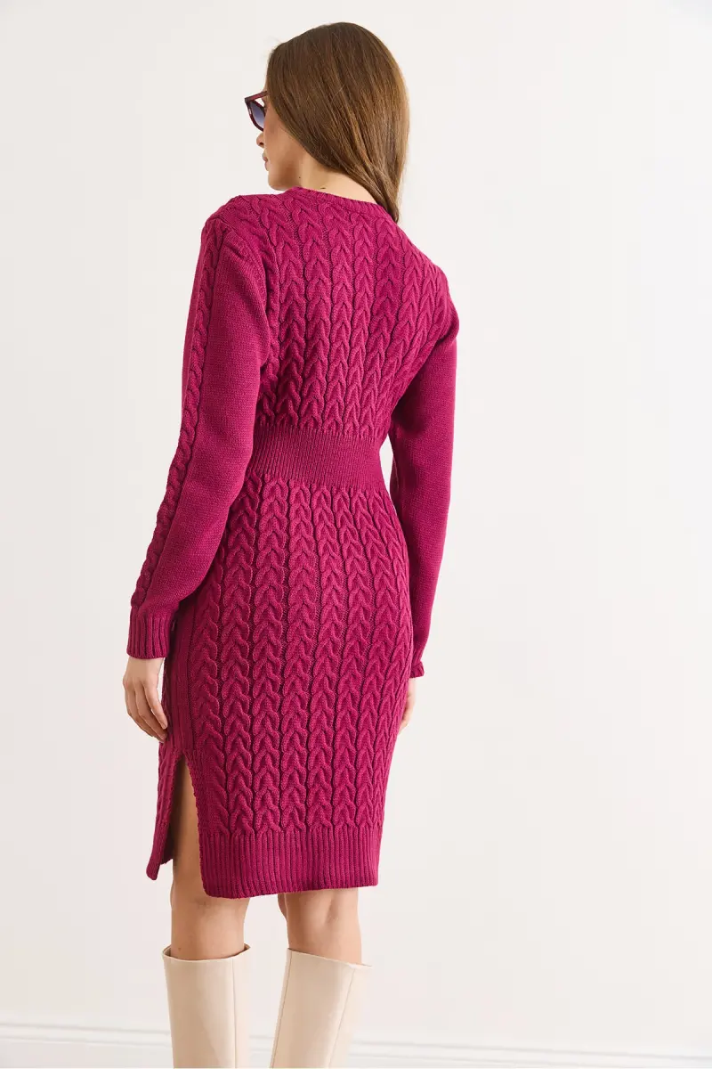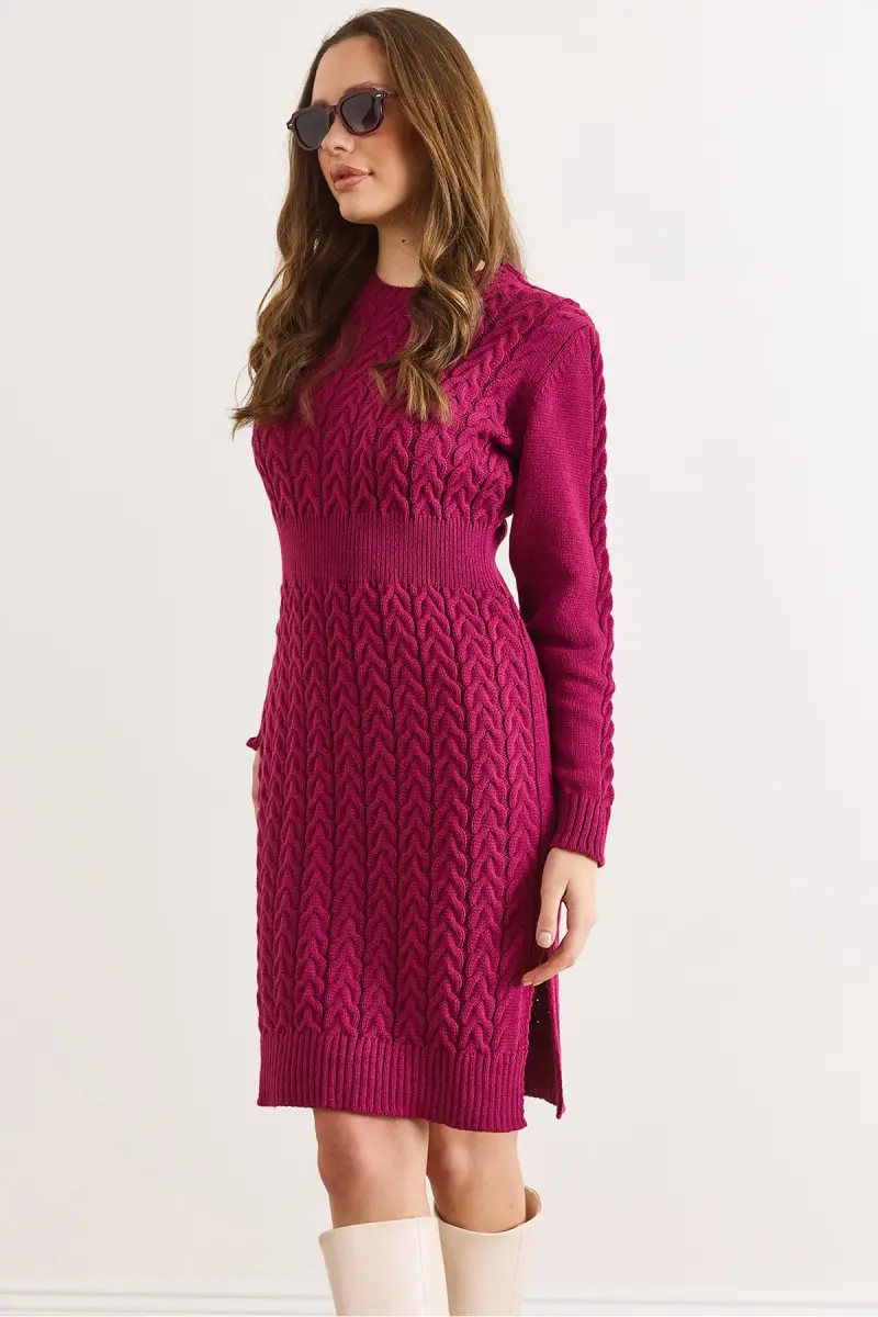 Kadın Vişne Çürüğü Beli Bantlı Yırtmaçlı Saç Örgü Mini Elbise ELB-19002289-Vişne Çürüğü
