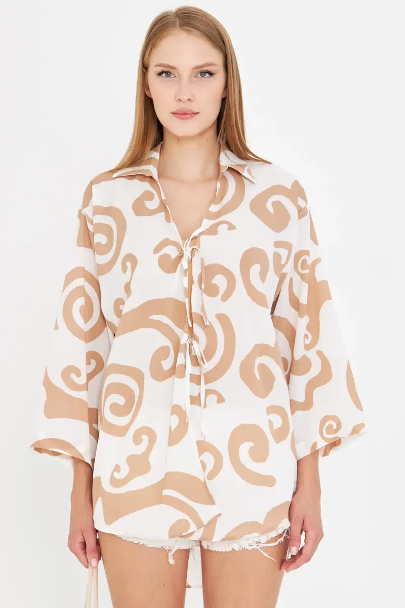Kadın Vizon Beyaz Gömlek Yakalı Önden Bağcıklı Kimono Gömlek ARM-25K001006-Vizon Beyaz