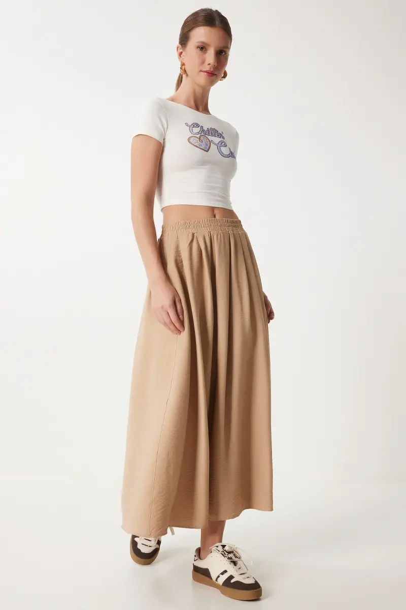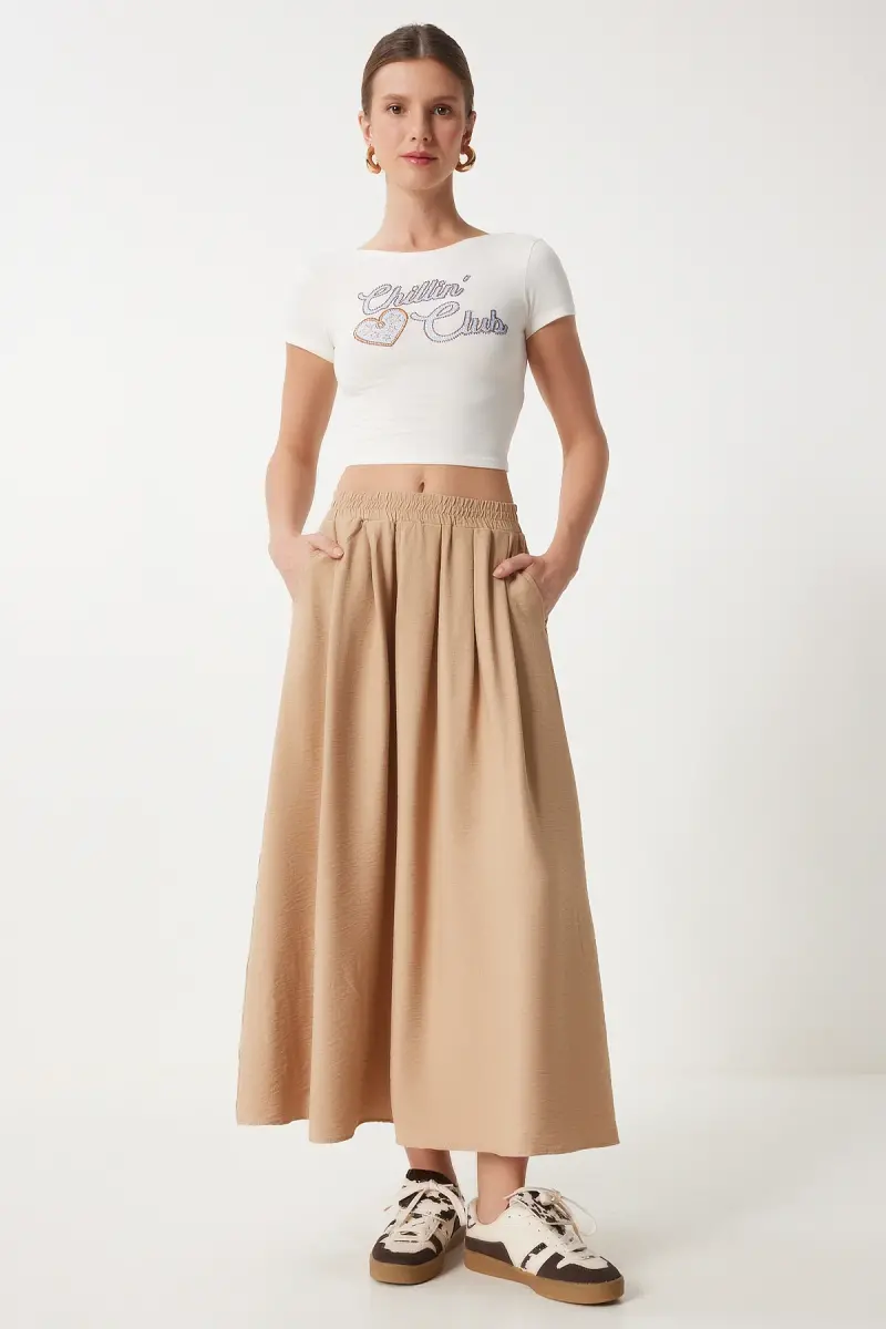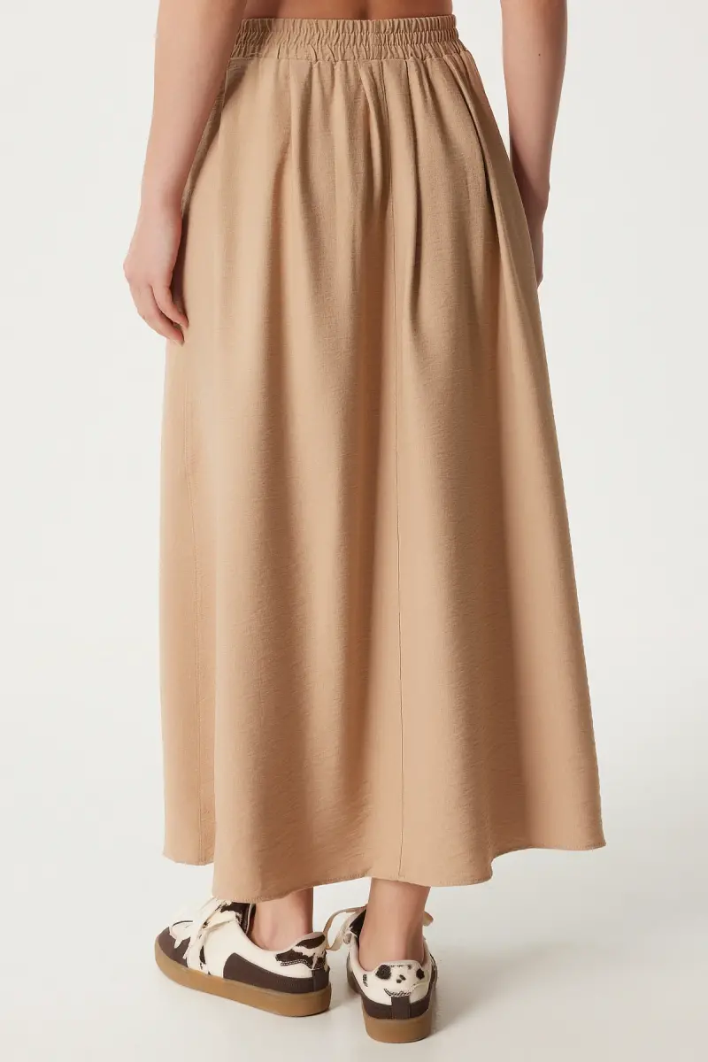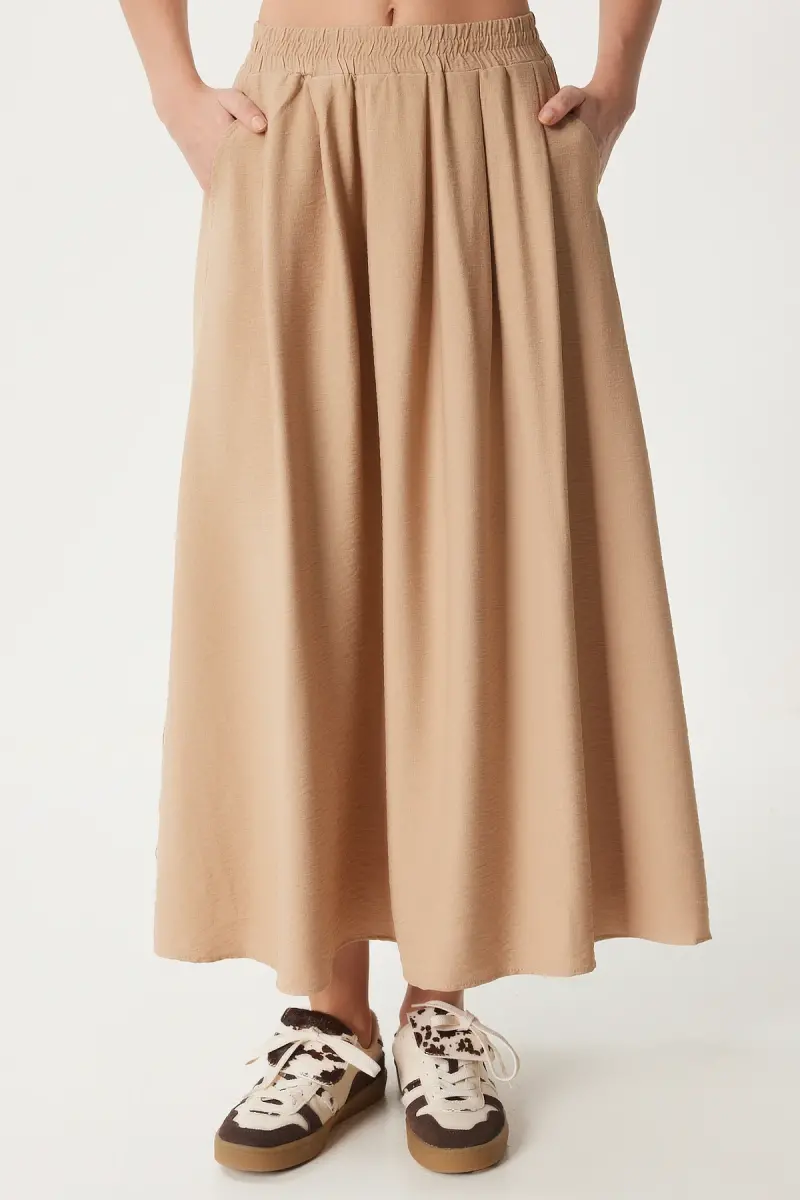Kadın Vizon Cepli Uzun Kloş Dokuma Etek US00933-Vizon