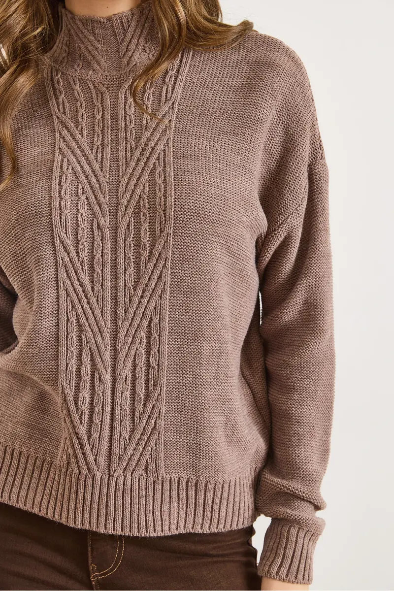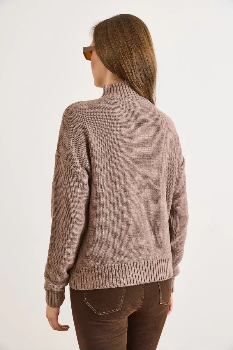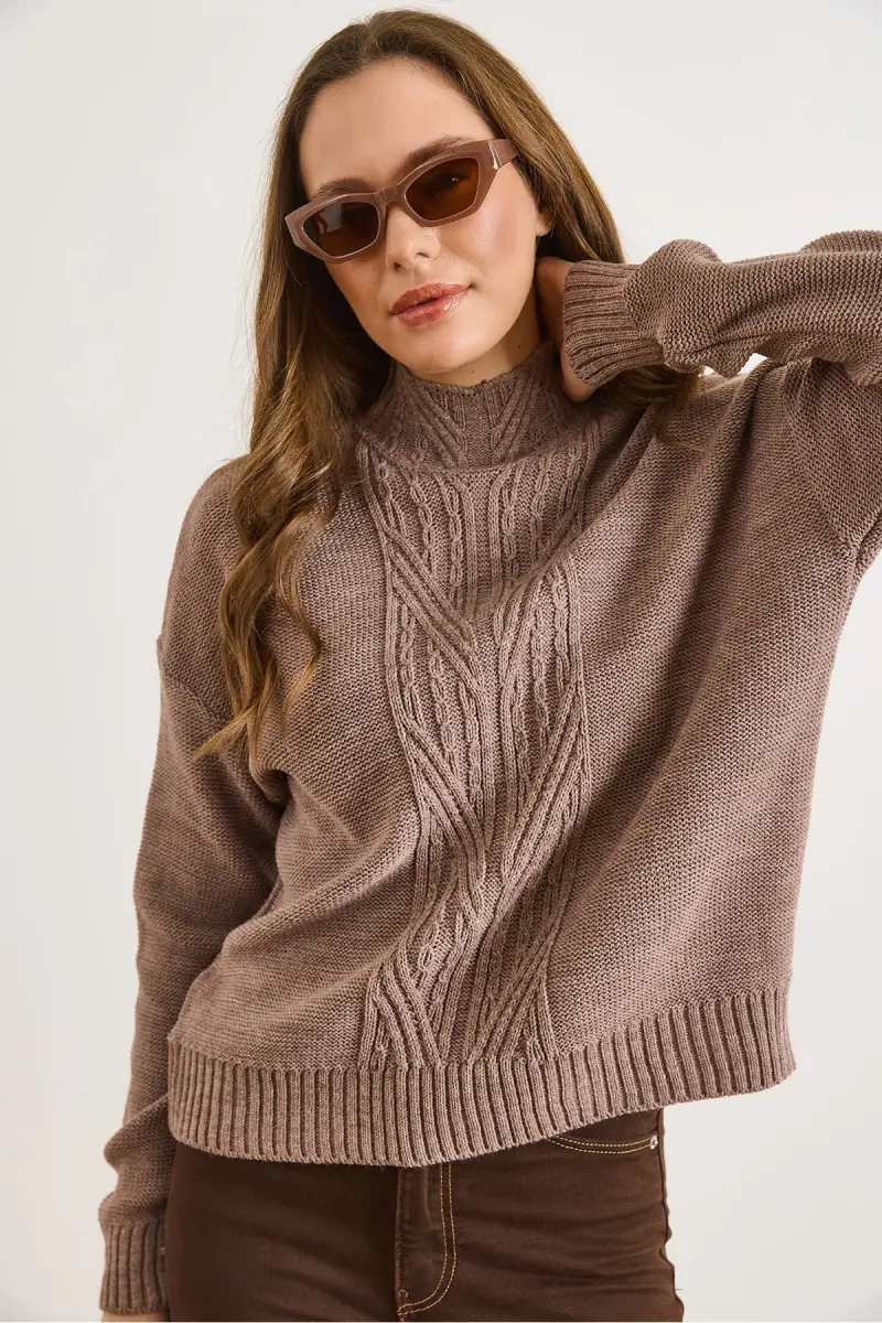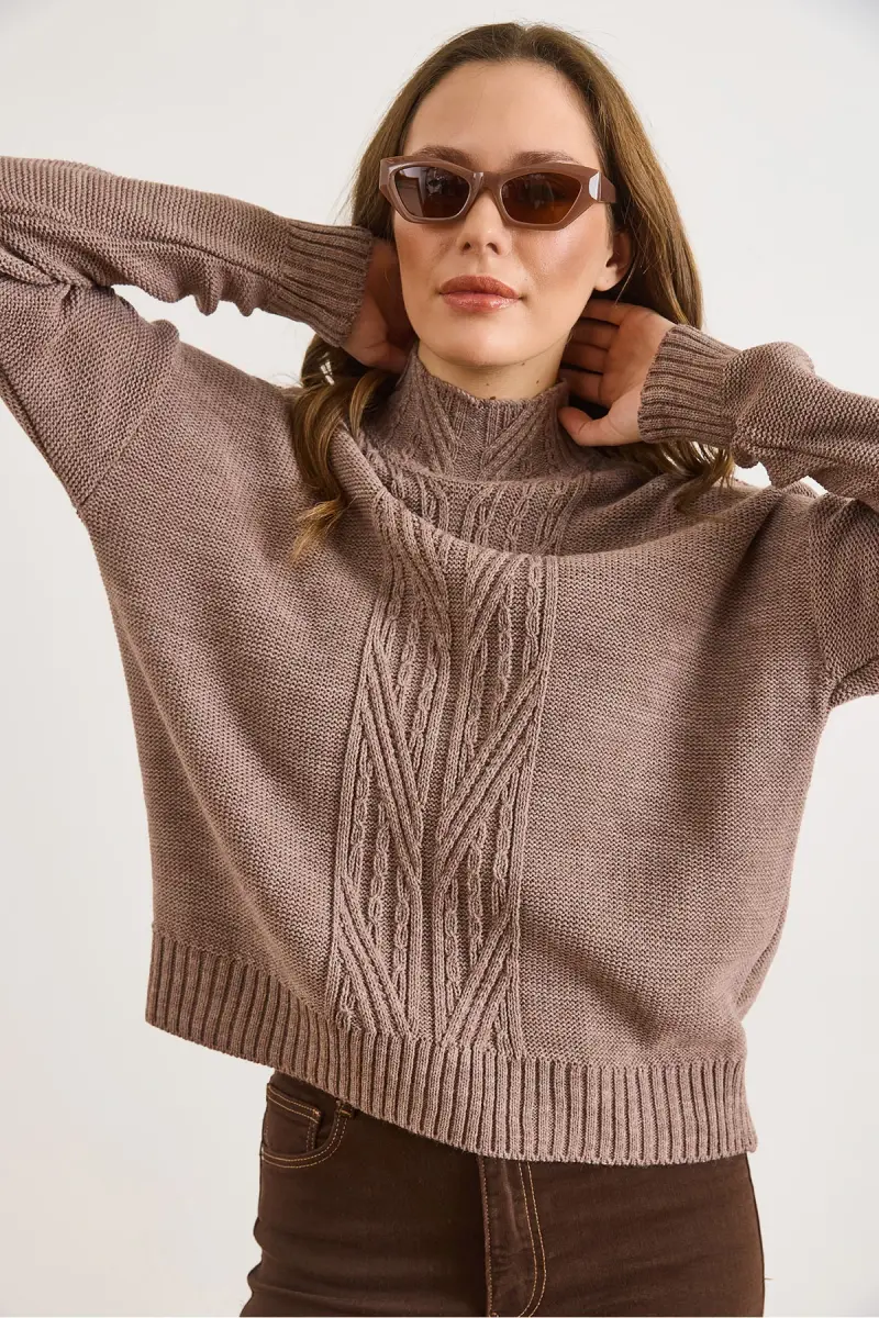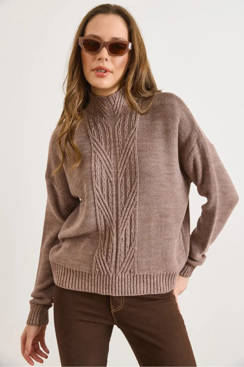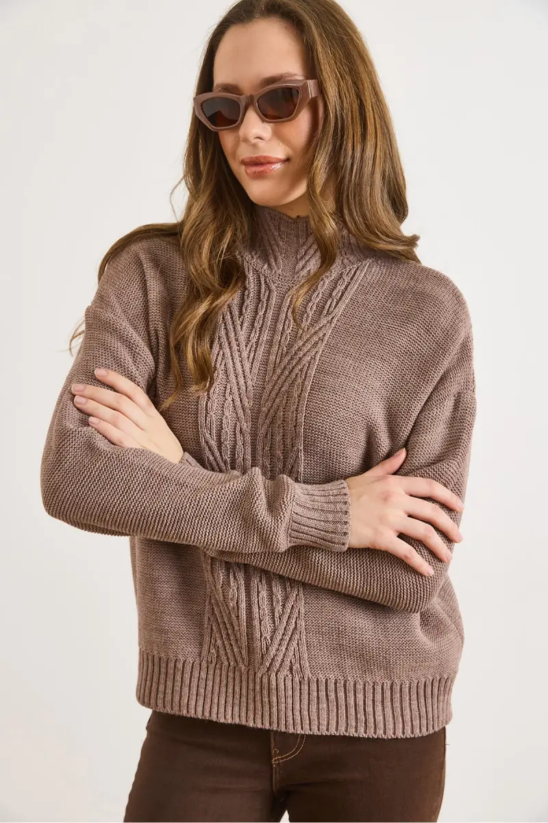Kadın Vizon Dik Yaka Ortası Saç Örgülü Triko Kazak KZK-19000912-Vizon