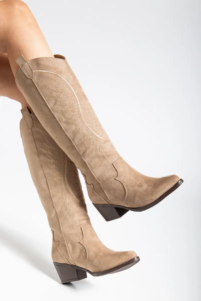 Kadın Vizon Süet Nakışlı Western Kovboy Cowgirl Bot Çizme-Vizon Süet