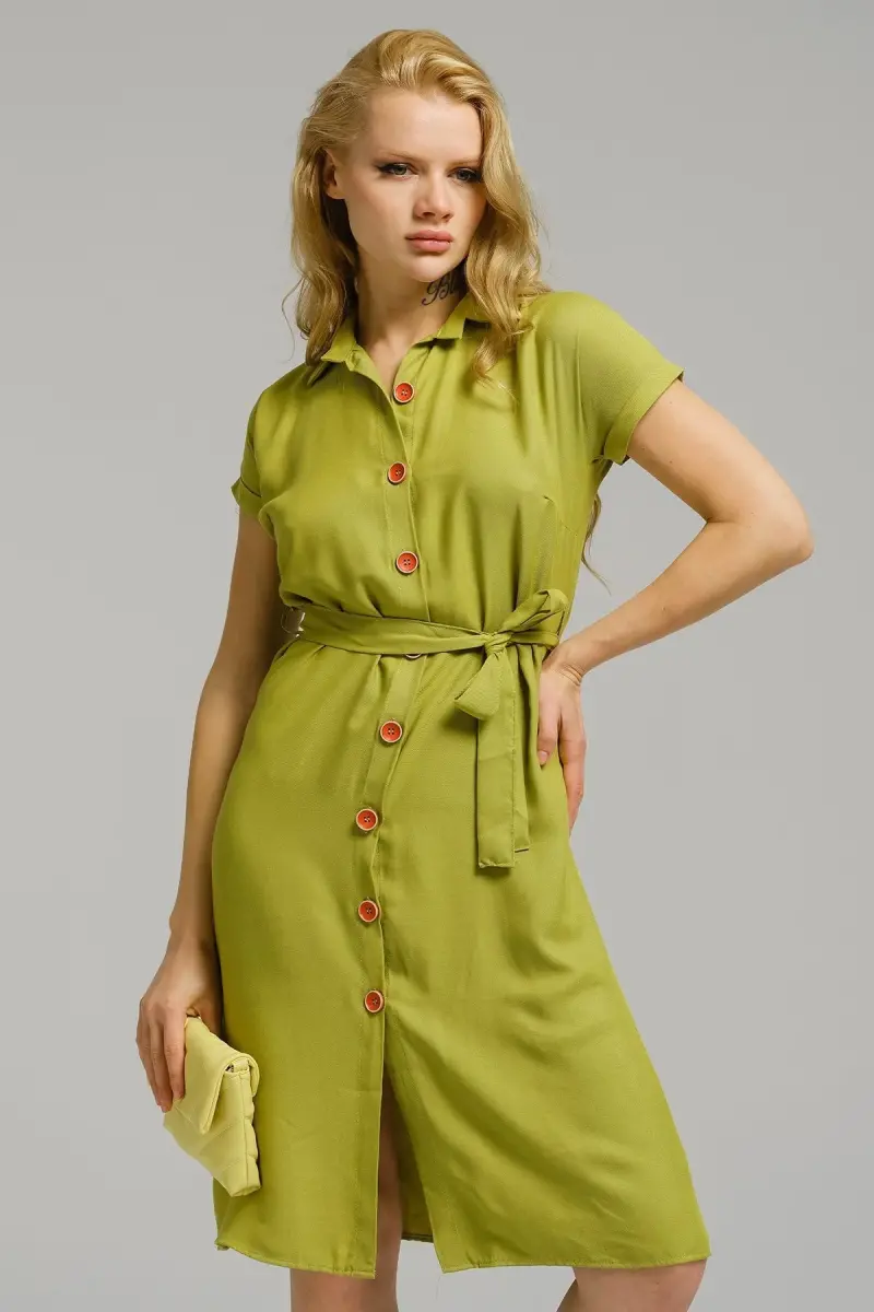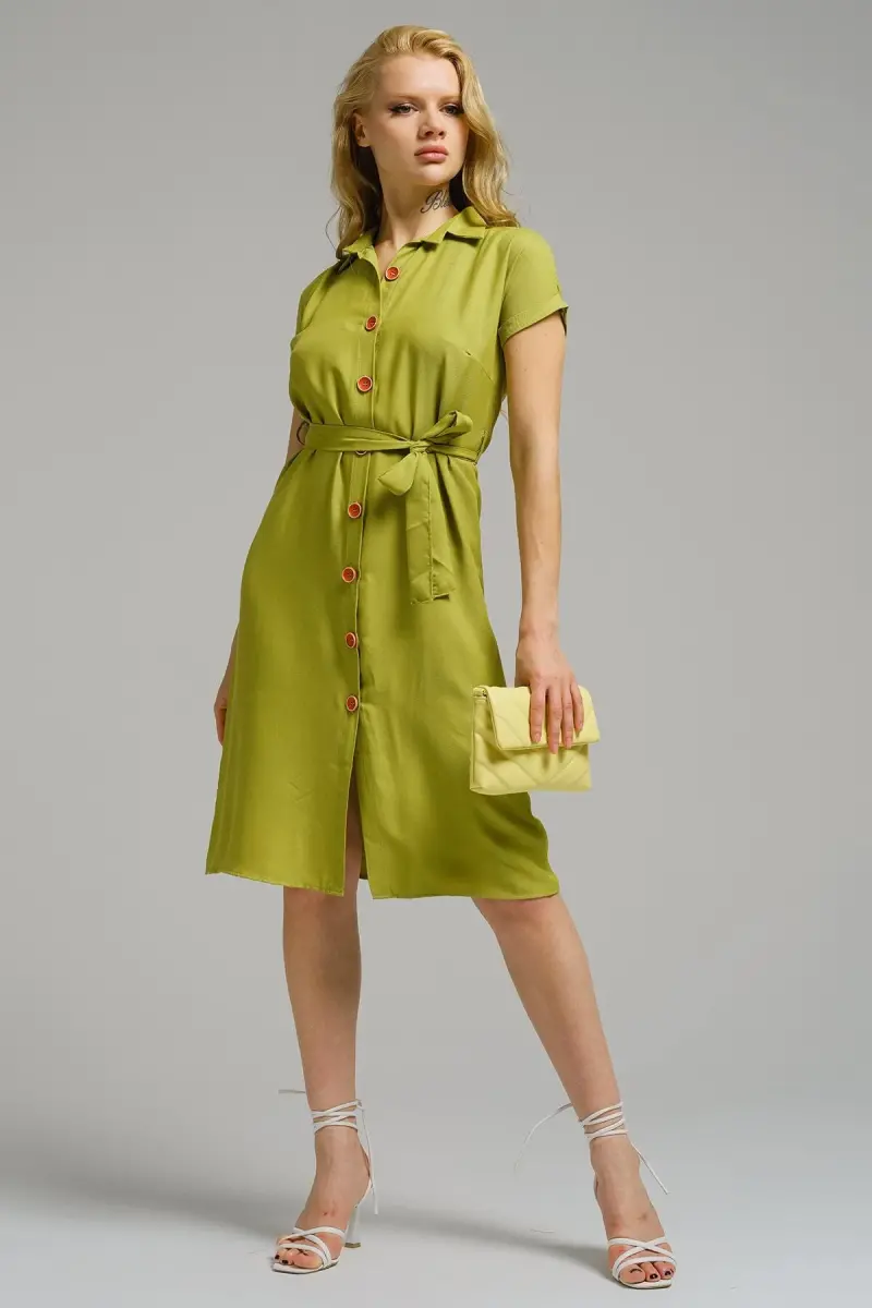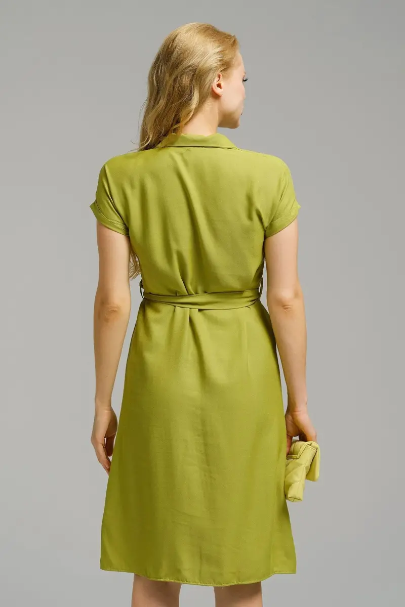 Kadın Yağ Yeşili Beli Kemerli Kısa Kol Gömlek Elbise ARM-19Y001068-Yağ Yeşili