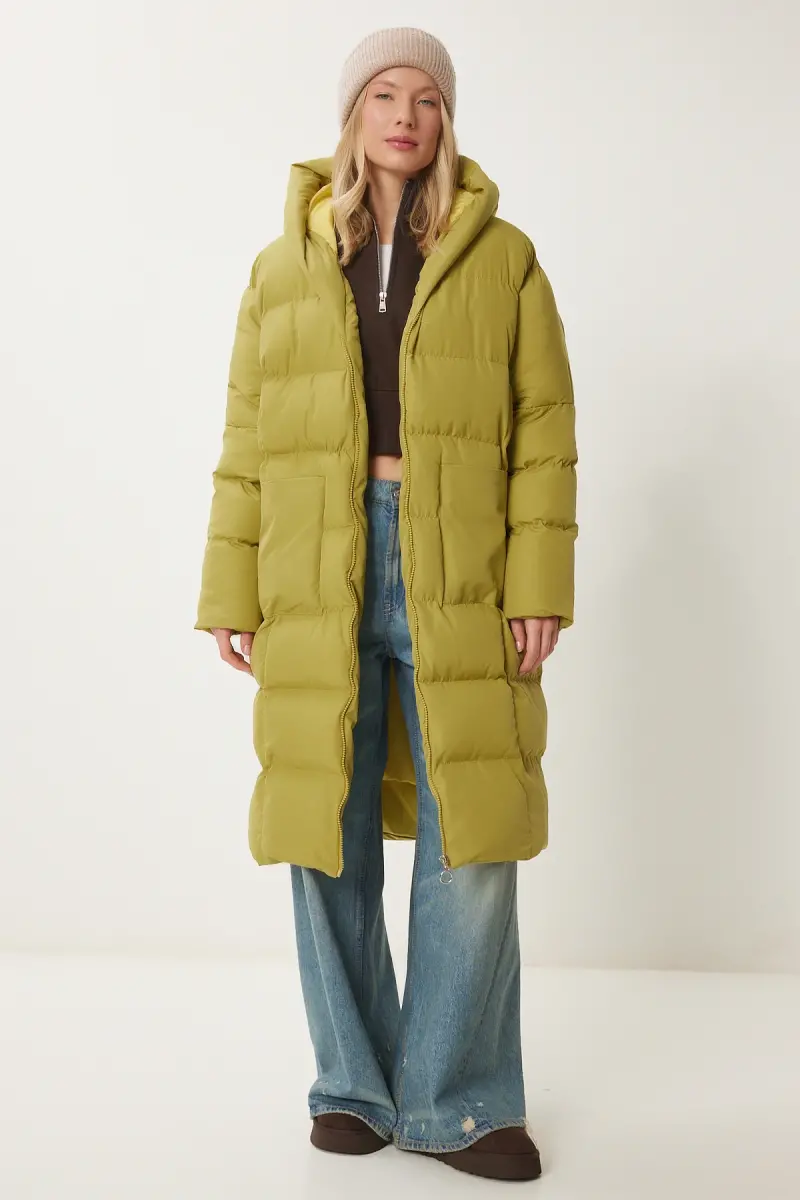 Kadın Yağ Yeşili Kapüşonlu Oversize Uzun Şişme Kaban NT00428-Yağ Yeşili