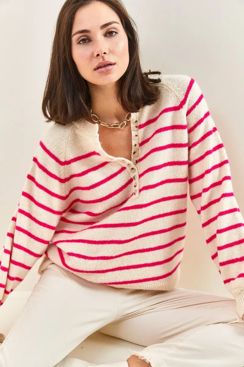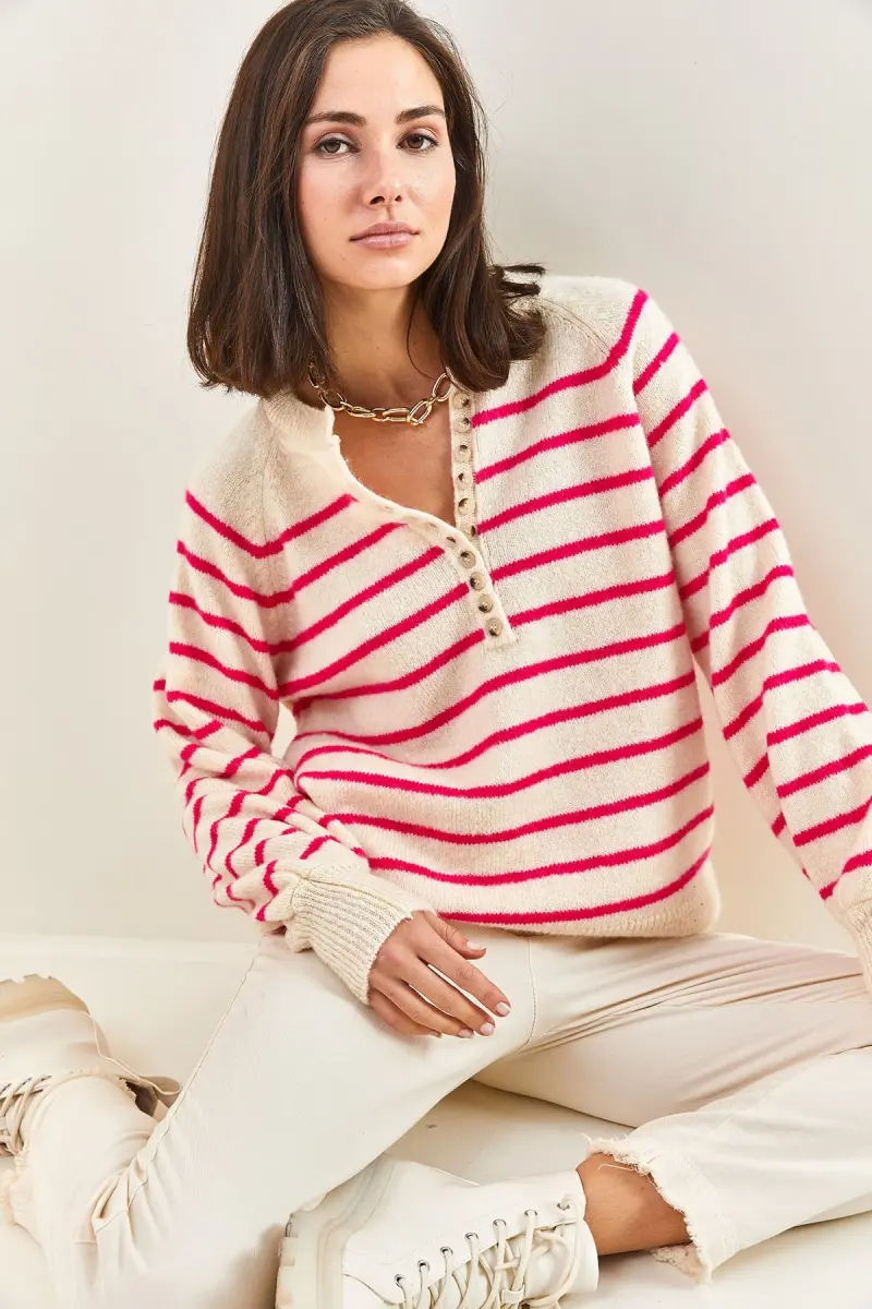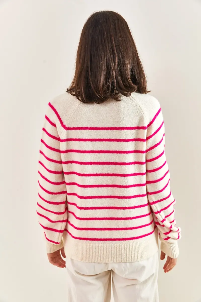 Kadın Yakası Ilikli Balıkçı Yaka Çizgili Triko Kazak-Bej