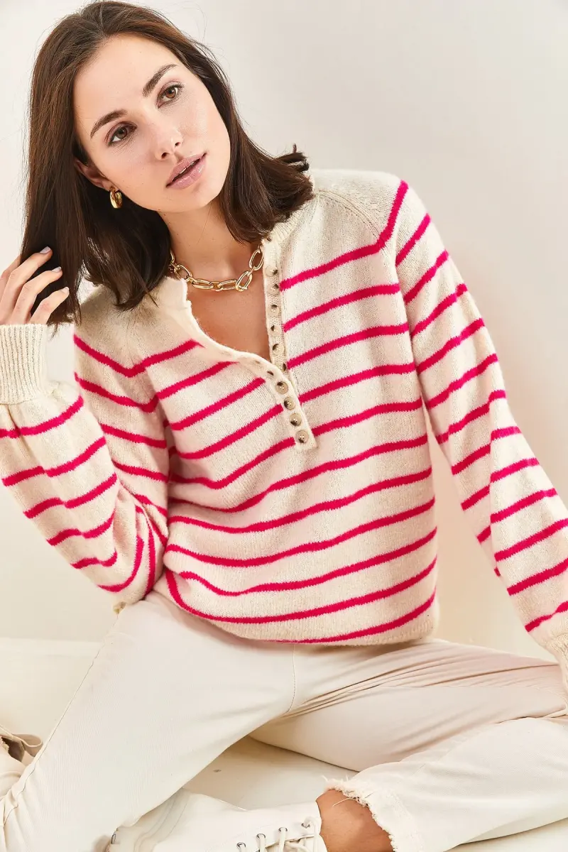 Bu ürün BİANCO LUCCİ tarafından gönderilecektir.Kampanya fiyatından satılmak üzere 10 adetten fazla stok sunulmuştur.Bir ürün, birden fazla satıcı tarafından satılabilir. Birden fazla satıcı tarafından satışa sunulan ürünlerin satıcıları ürün için belirledikleri fiyata, satıcı puanlarına, teslimat statülerine, ürünlerdeki promosyonlara, kargonun bedava olup olmamasına ve ürünlerin hızlı teslimat ile teslim edilip edilememesine, ürünlerin stok ve kategorileri bilgilerine göre sıralanmaktadır.Bu üründen en fazla 10 adet sipariş verilebilir. 10 adedin üzerindeki siparişleri Trendyol iptal etme hakkını saklı tutar. Belirlenen bu limit kurumsal siparişlerde geçerli olmayıp, kurumsal siparişler için farklı limitler belirlenebilmektedir.15 gün içinde ücretsiz iade. Detaylı bilgi için [page="return_conditions"]tıklayın .Triko kumaştan üretilmiş olup, yumuşak dokusuyla konforlu bir kullanım sunar.Standart beden seçeneğiyle farklı vücut tiplerine uyum sağlar.Günlük kullanıma uygun casual tasarımıyla rahatlık ve şıklığı bir arada sunar.Çizgili deseniyle modern ve zamansız bir görünüm kazandırır.Tek parça halinde tasarlanmıştırkombin yapmak için ekstra çaba gerektirmez.Akrilik dokuma tipi sayesinde hafif ve dayanıklıdır, uzun süreli kullanım için idealdir.Akrilik-polyester karışım materyali ile esneklik ve dayanıklılığı artırarak formunu korur.Regular kalıp ile vücudu sarmadan rahat bir oturuş sağlar.Dik yaka tasarımı ile hem sıcak tutmayı hem de stil sahibi bir duruş sergiler.Basic silueti sayesinde kolayca kombinlenebilir ve her ortamda rahatlıkla tercih edilebilir.Bej-fuşya renk uyumu canlılık katarken, tüm yaş gruplarına hitap eden tarza sahiptir.Orta kalınlıkta yapılandırılmış olup mevsim geçişlerinde ideal bir seçimdir.Düz kesimiyle basit ama etkili bir görünüm elde edilirken, doğal düğme detaylarıyla sofistike bir hava katılır.Uzun kollu tasarım soğuk havalarda ekstra koruma sağlarken, regular boy belinizi zarifçe sarar.Kolay yıkama talimatları sayesinde bakımı pratiktir ve uzun süre ilk günkü gibi kalmasını sağlar.