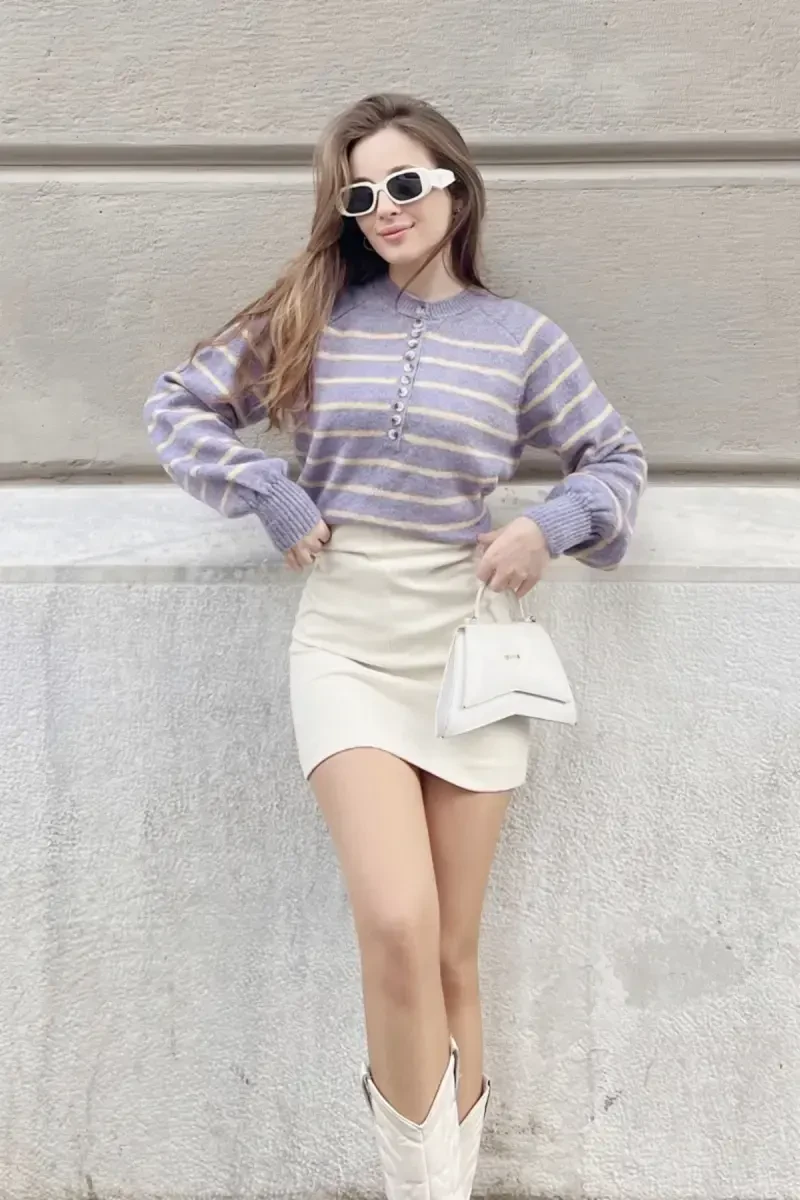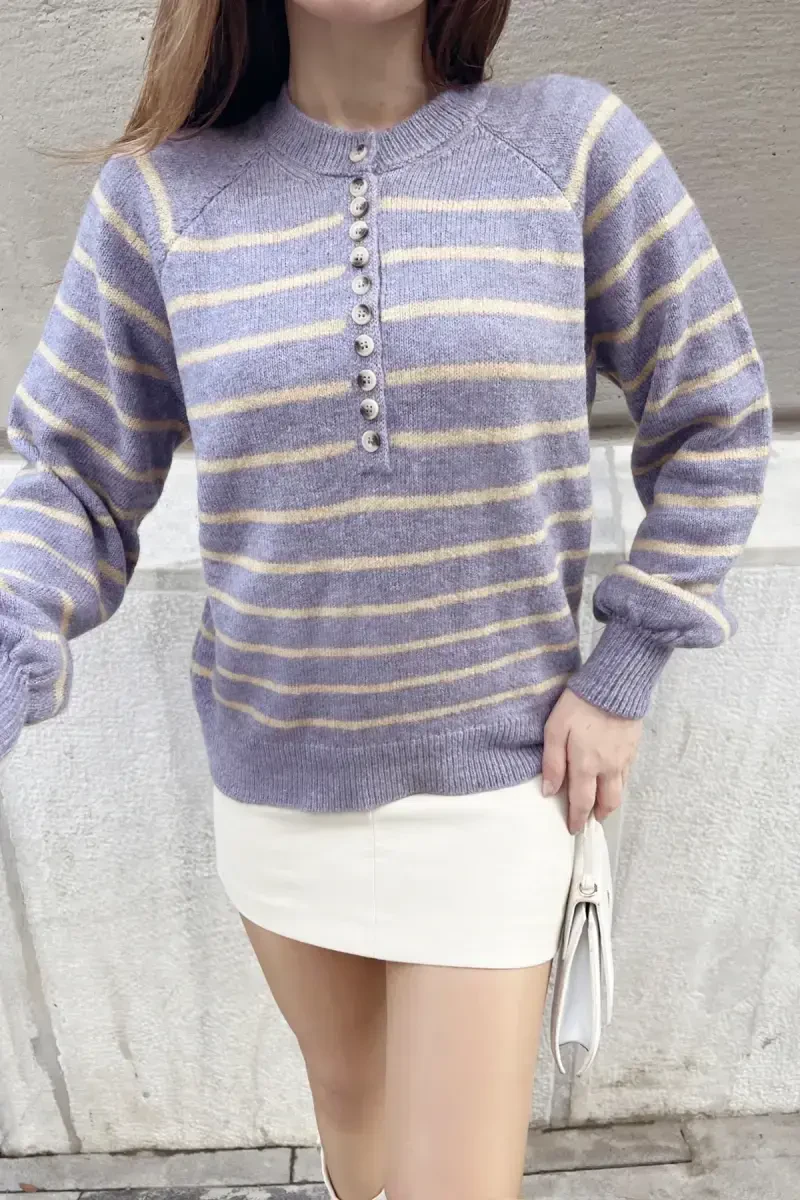 Women's Buttoned Ribbed Fisherman's Collar Striped Knit Sweater is a perfect option for women looking for a style that is both stylish and warm. The calming effect of the lilac color combines with the modern touch of the striped pattern to create a unique design. The fisherman's collar gently wraps your neck in cold weather and protects you from the wind. In addition, the buttoned details on the collar add a different dimension to the sweater and highlight your elegance. High-quality knit material ensures you feel comfortable and comfortable all day long. This material, which offers a soft touch to your skin, also promises long-lasting use. The striped pattern of the sweater creates a lively and dynamic look, while the lilac color adds an elegant touch to your combinations. Ideal for daily use, this sweater can be easily combined with jeans, skirts or leggings. This knit sweater, which you can easily choose for the office, meeting friends or a special event, allows you to reflect your style in any environment. It is an indispensable piece for women who want to achieve both a stylish and comfortable look. This sweater, which will be one of the cornerstones of your wardrobe, also attracts attention with its wearable structure in every season. It keeps you warm on cold winter days and adds a light touch to your style in spring. Enjoy a stylish and comfortable style with the Women's Buttoned Ribbed Fisherman's Collar Striped Knit Sweater. This sweater is not just a piece of clothing, but also a way to express your style. This sweater, which contains care and quality in every detail, is a candidate to be one of the most loved pieces of your wardrobe.