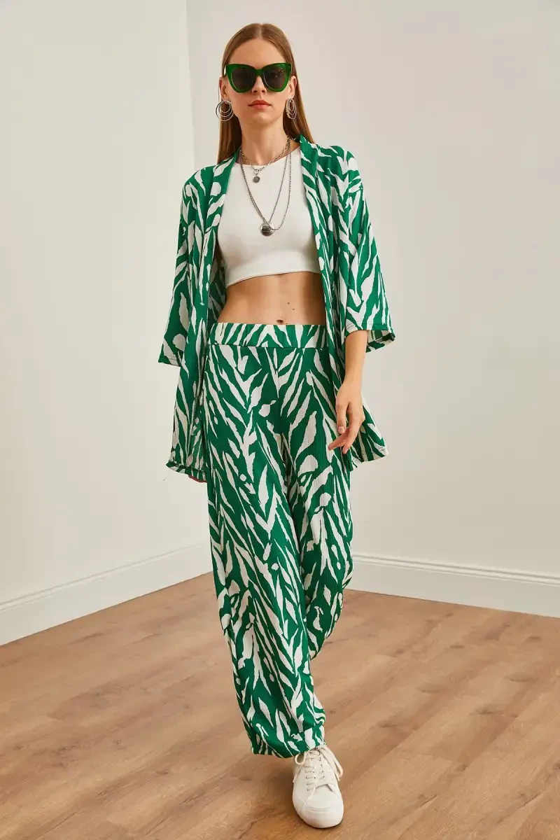 The Women's Leaf Green Top Kimono Bottom Pocketed Pants Suit is a combination that brings together elegance and comfort, attracting attention with its special design. This unique suit is offered with the assurance of Olalook Official and is a candidate to become an indispensable part of your wardrobe. Whether for daily use or for special occasions, this suit allows you to make a difference in any environment with its modern and elegant appearance. The leaf green color reflects the freshness and vitality of nature, while the harmony of the kimono top and pocketed trousers creates a stylish silhouette. The fabric quality of the suit offers a comfortable wearing experience throughout the day. It does not restrict your freedom of movement with its light and draped structure. The comfortable cut of the kimono top adapts to different body types, while the practicality of the pocketed trousers makes your daily life easier. This suit not only looks stylish, but also stands out with its functional features. You can create different styles by combining the top and bottom pieces separately, and you can easily match them with other pieces in your wardrobe. Whether you get a stylish look with heels or a more comfortable style with sneakers, this suit will accompany you in any situation. The material of the product is 100% polyester, so it is easy to iron and long-lasting. The durability of the fabric ensures that it is suitable for frequent use. The S/36 size on the model is important for you to see how the product fits and stands on the body. Colors may vary due to light differences in studio shots, so there may be slight differences between the actual color of the product and the photo. This situation emphasizes the naturalness and uniqueness of the product. The Women's Leaf Green Top Kimono Bottom Pocketed Pants Suit is an ideal choice for women who care about both elegance and comfort. You can choose this suit to feel special and reflect your style. Offered with the quality of Olalook Official, this product will be one of the most loved pieces of your wardrobe and will always give you a stylish and confident look.