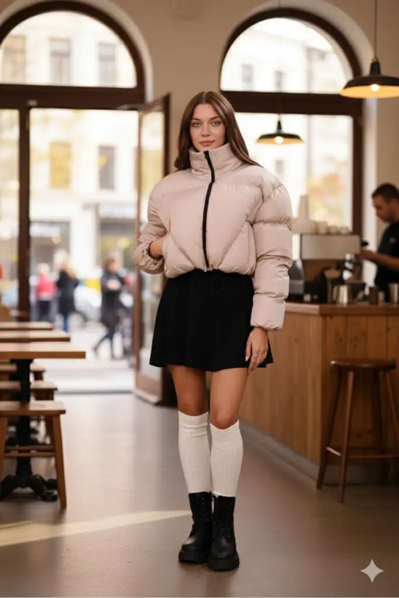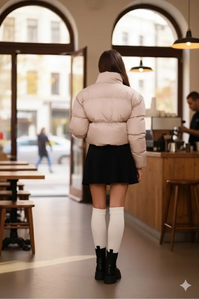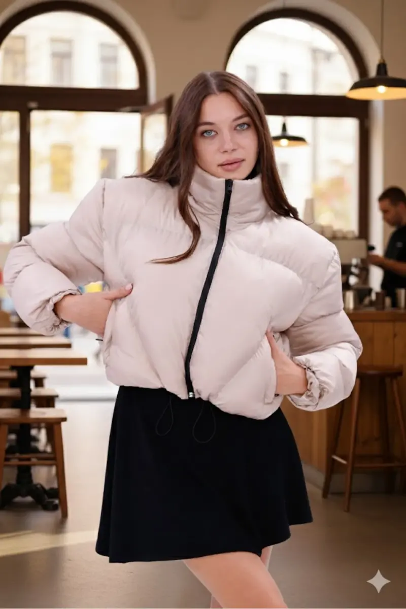 Kadın Yeni Sezon Çapraz Dikişli Kışlık Mont Lastik Detaylı Crop-Bejcropmont3